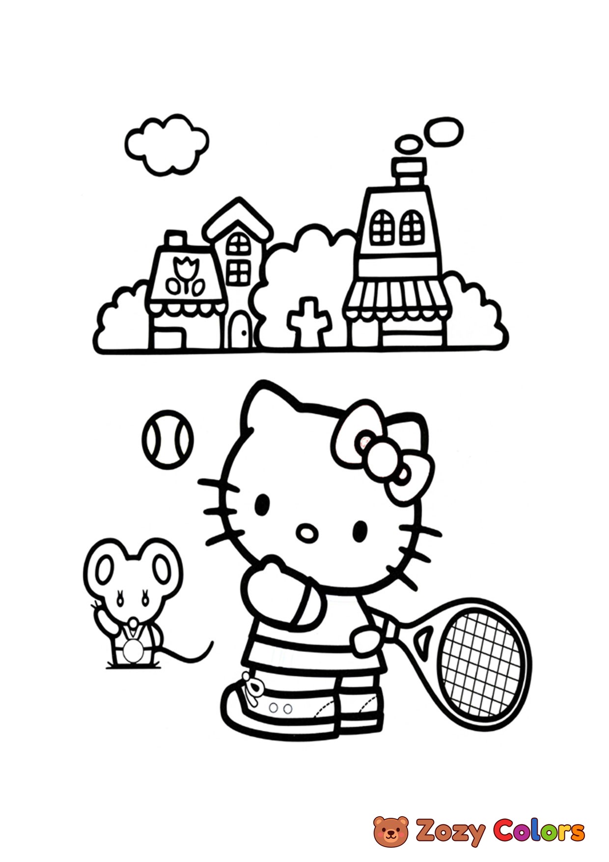 Hello Kitty playing tennis. Coloring page to print or download and color for your kids.