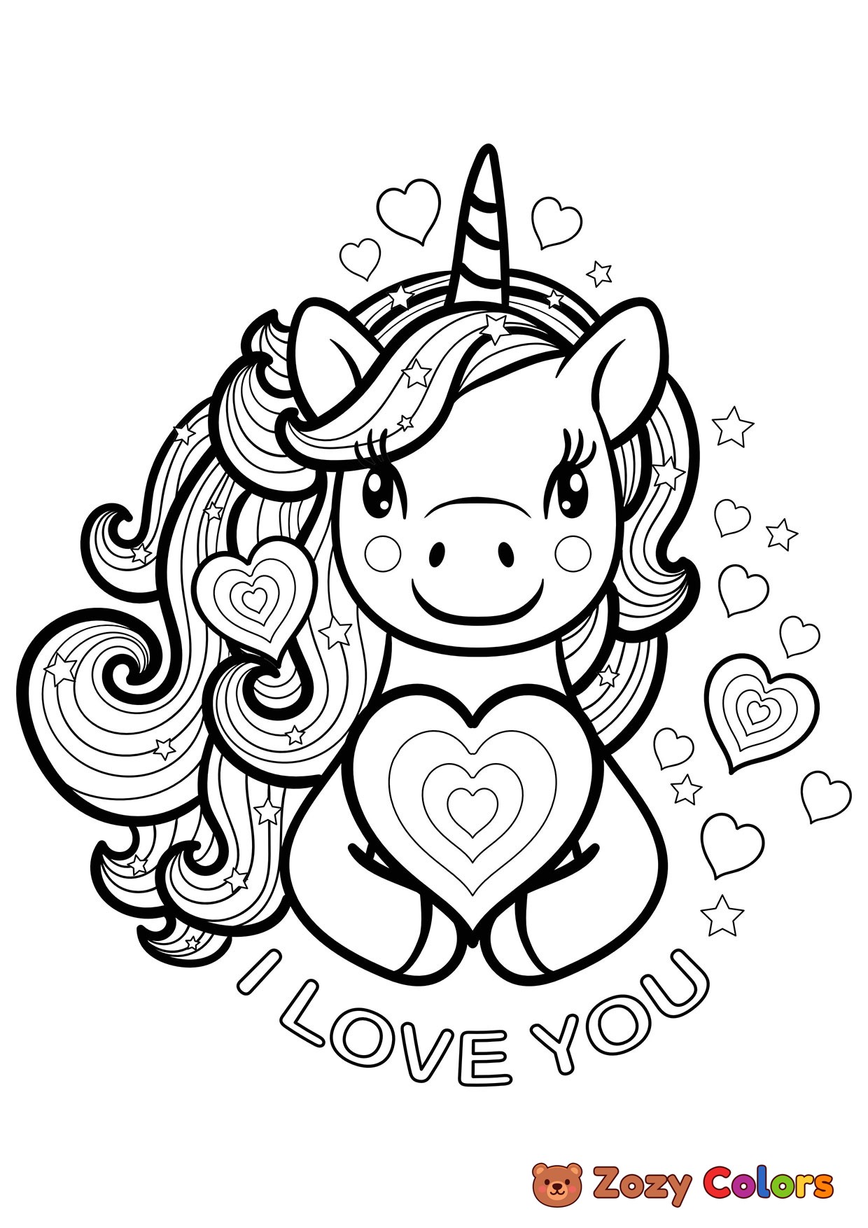 I love you unicorn. Coloring page to print or download and color for your kids.