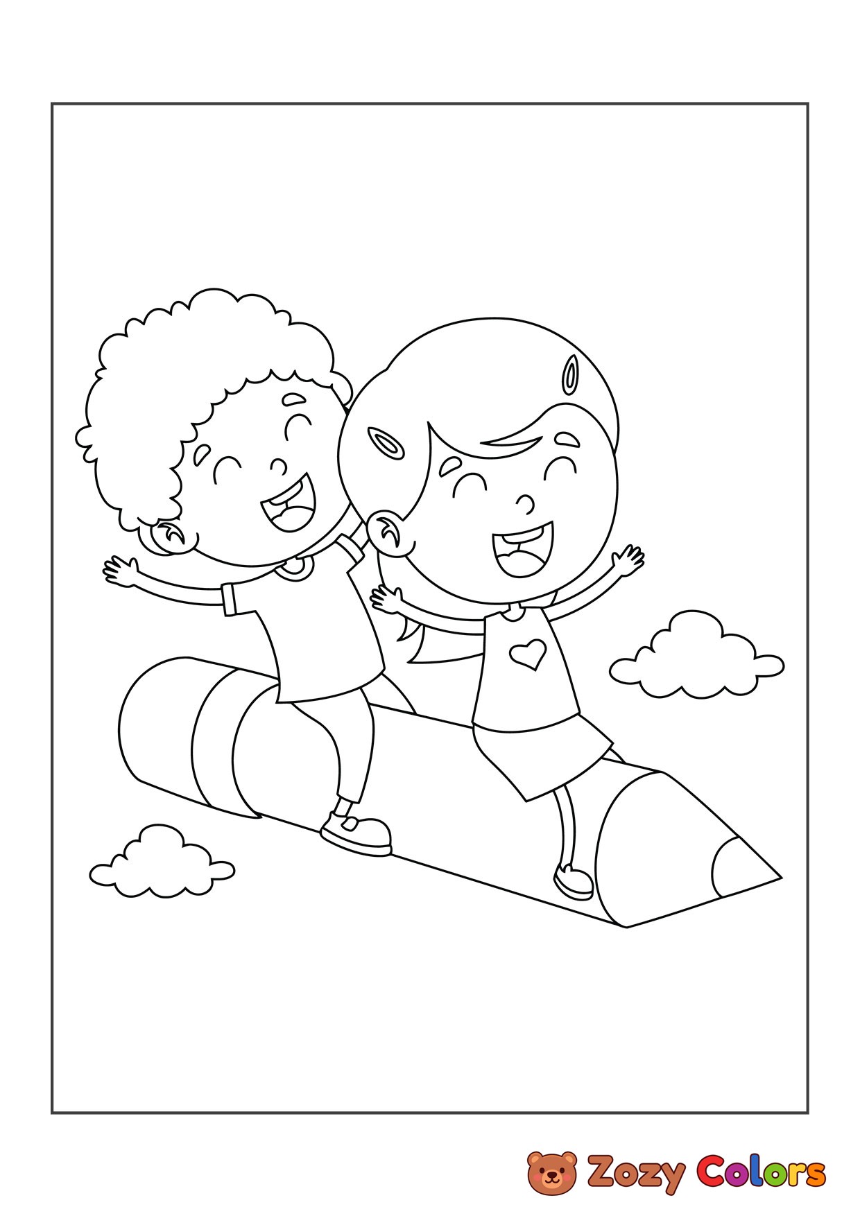 Kids on a rocket. Coloring page to print or download and color for your kids.