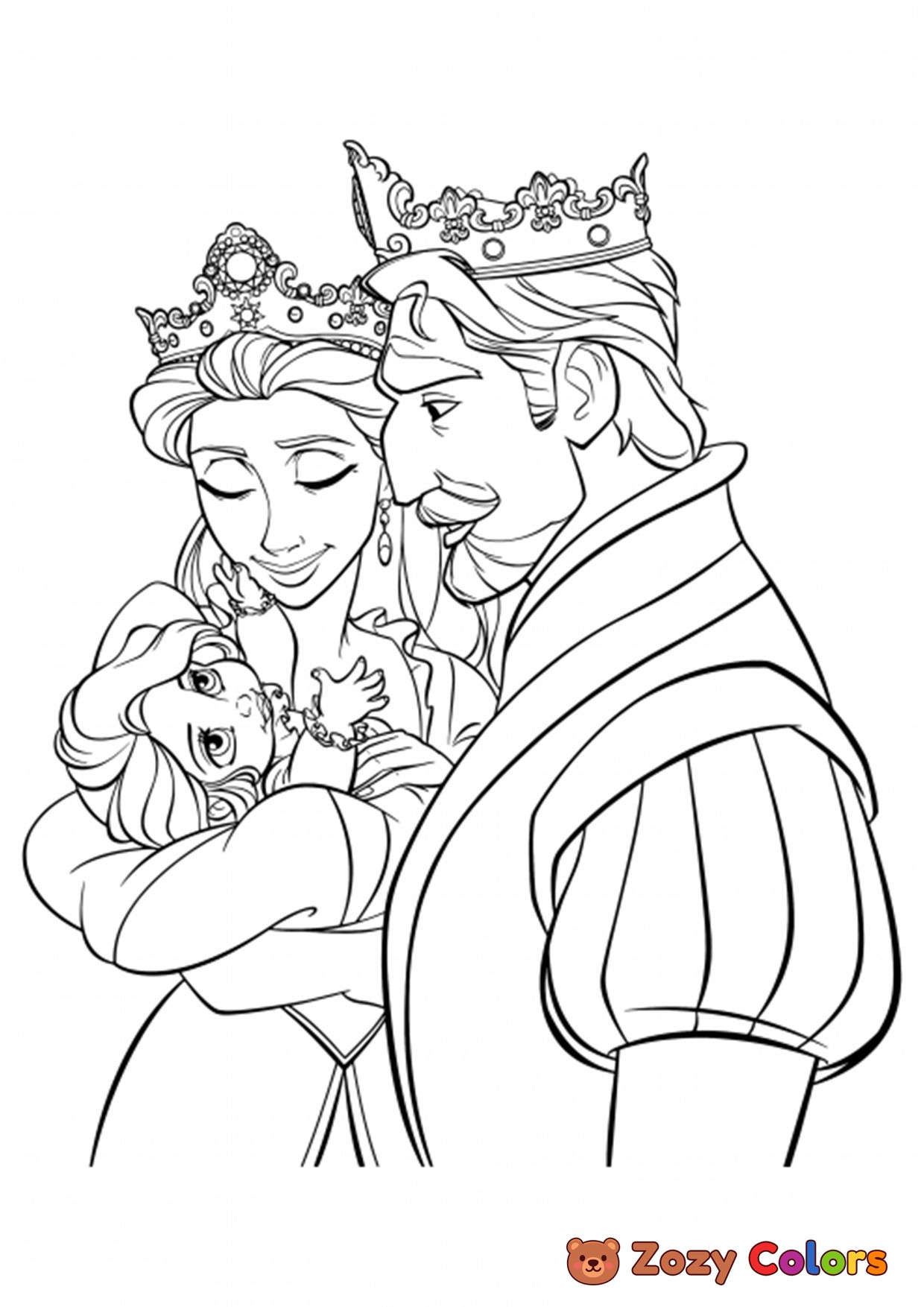 King and Queen with baby Rapunzel. Coloring page to print or download and color for your kids.