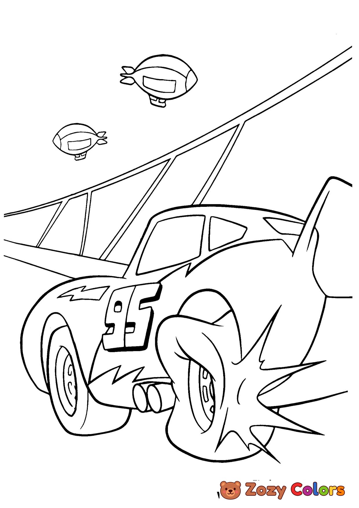 Lightning McQueen's tire has blown. Coloring page to print or download and color for your kids.