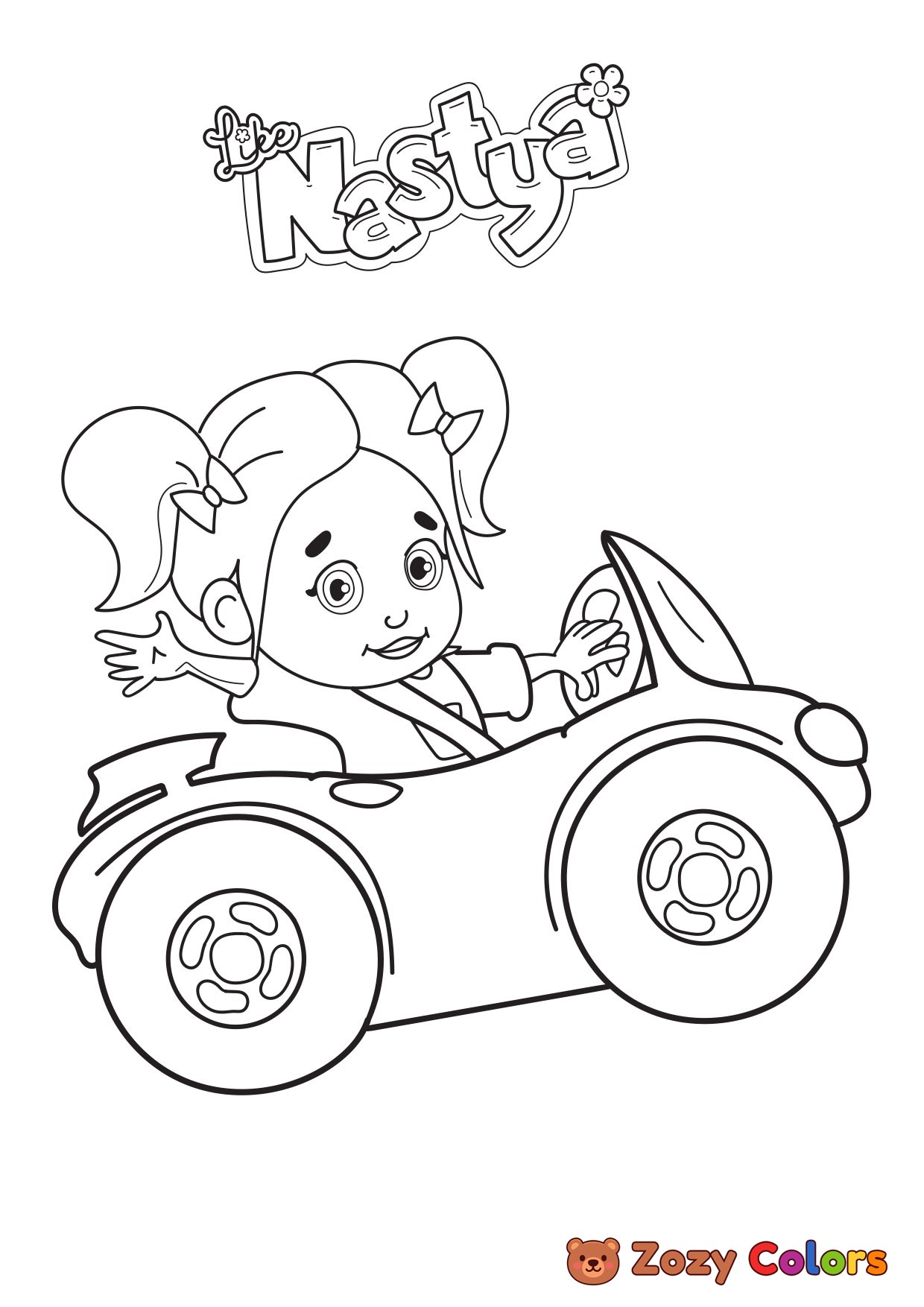 LIke Nastya in a car. Coloring page to print or download and color for your kids.