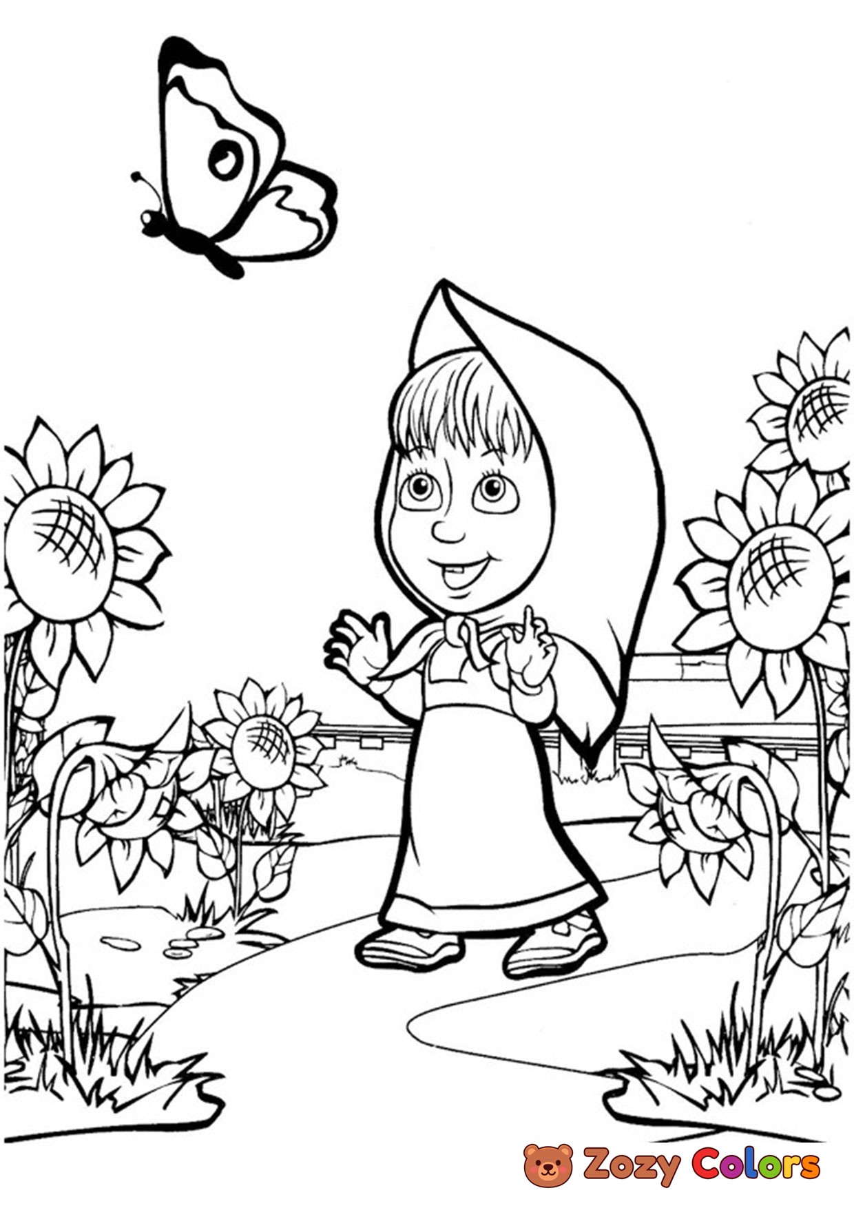 Masha with buterfly. Coloring page to print or download and color for your kids.