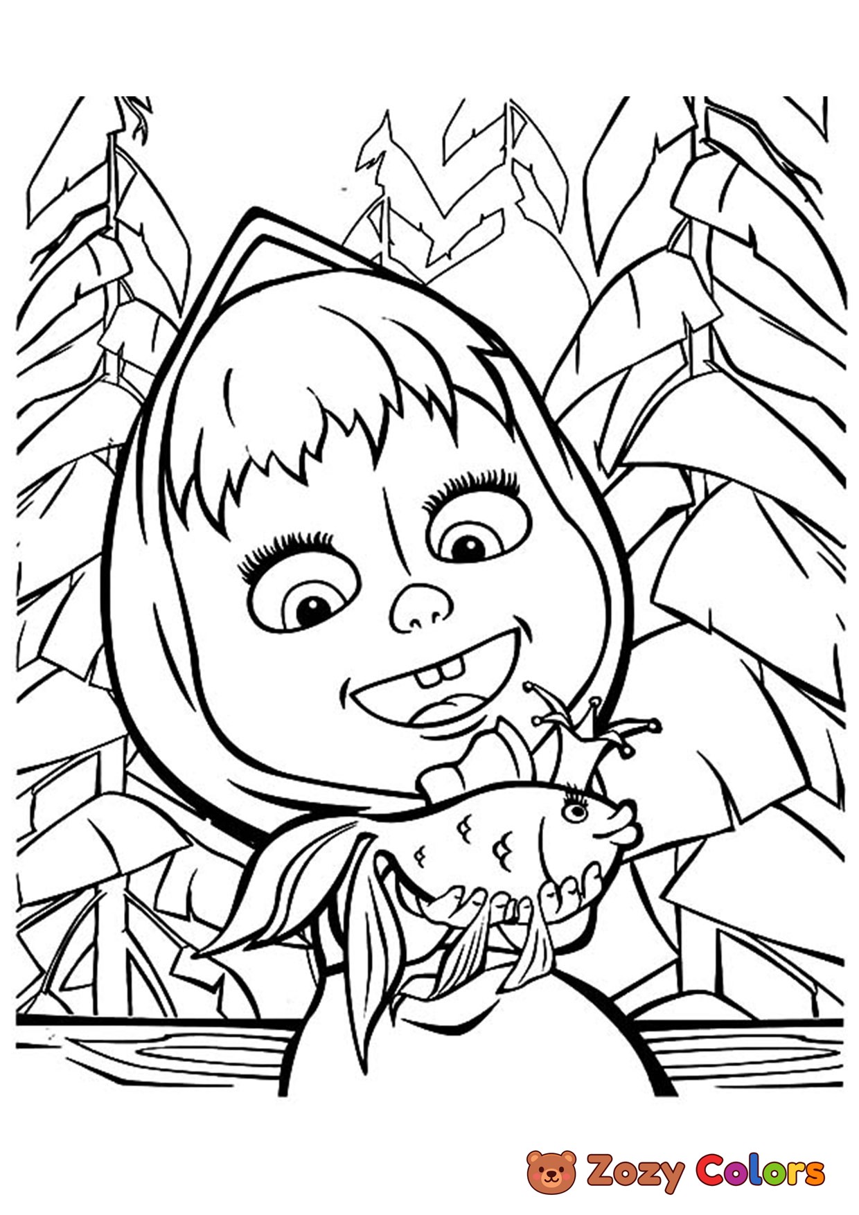 Masha with goldfish. Coloring page to print or download and color for your kids.