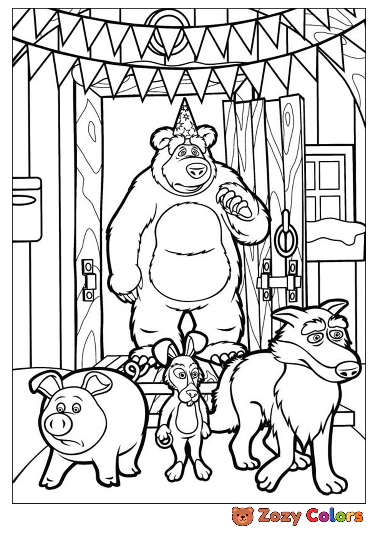 Mashas birthday party. Coloring page to print or download and color for your kids.