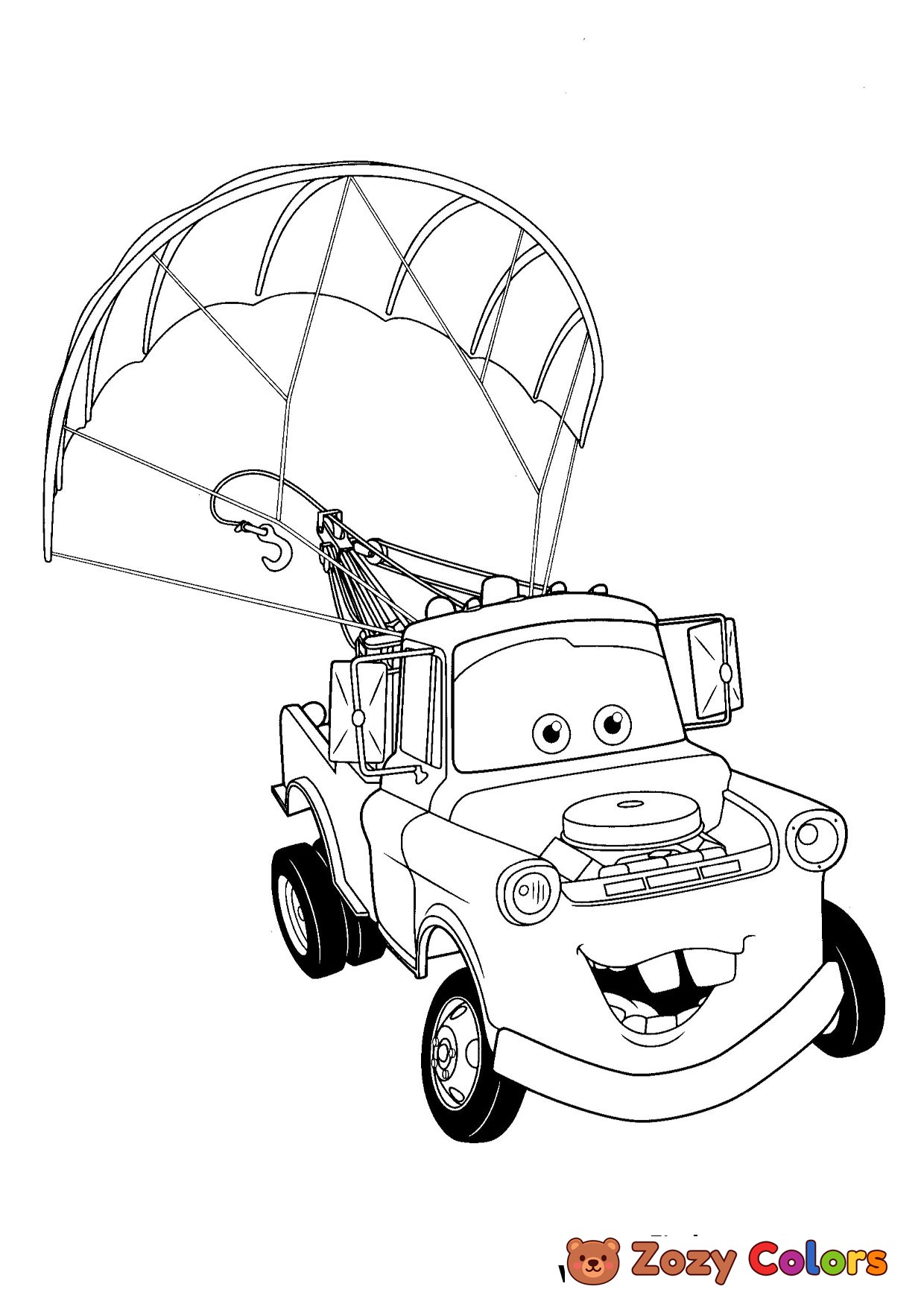 Mater droping by a parachute. Coloring page to print or download and color for your kids.