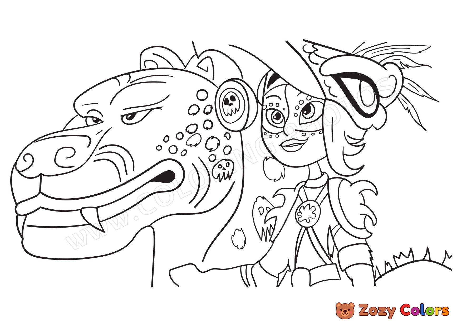 Maya and Chiapa on the hunt | Maya and the Three. Coloring page to print or download and color for your kids.