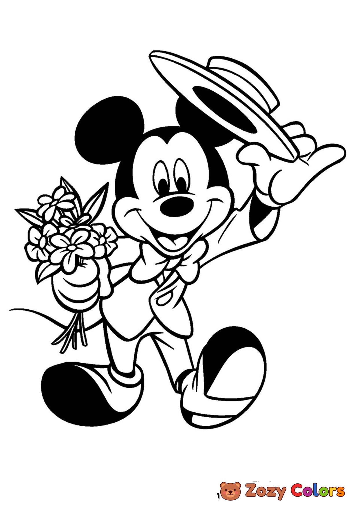 Mickey Mouse with flowers going for a walk. Coloring page to print or download and color.