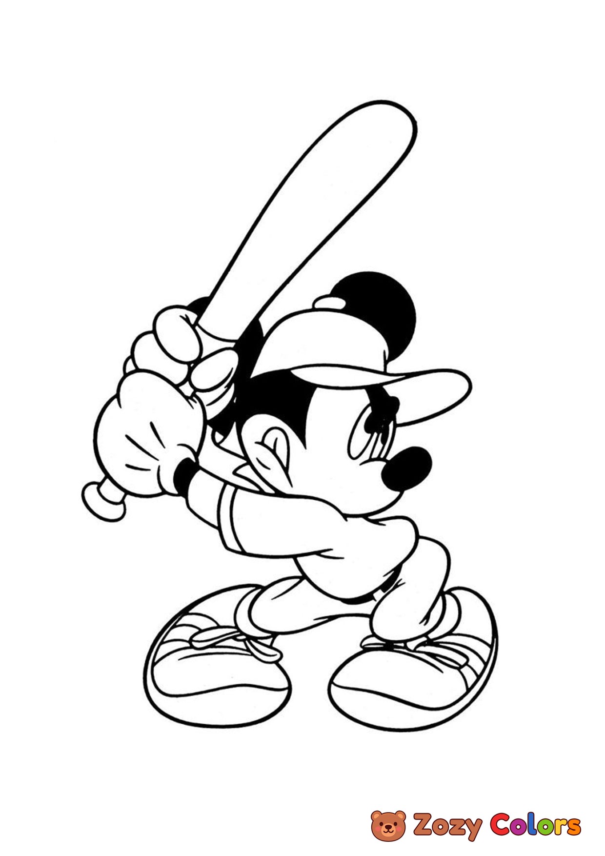 Mickey Mouse playing baseball. Coloring page to print or download and color for your kids.