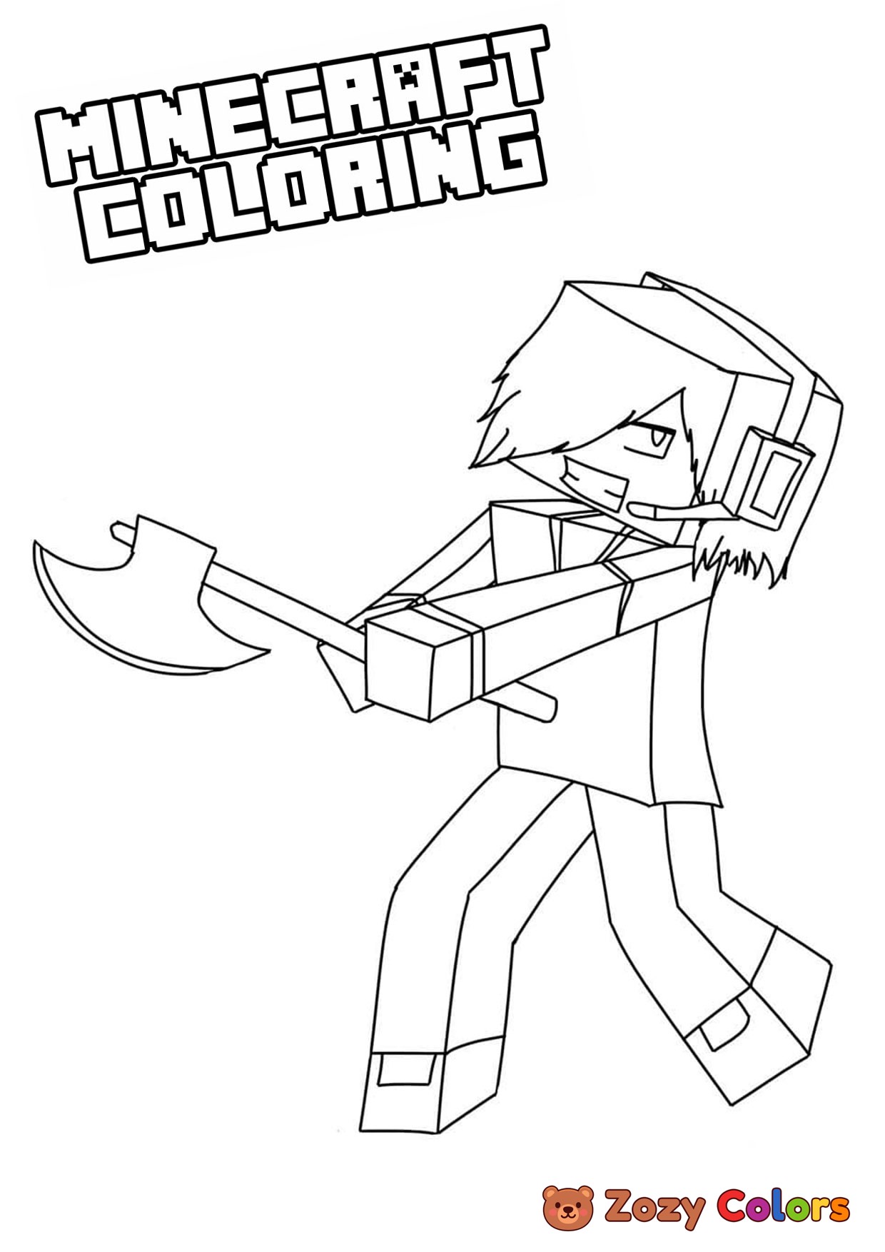 Minecraft character with axe. Coloring page to print or download and color for your kids.
