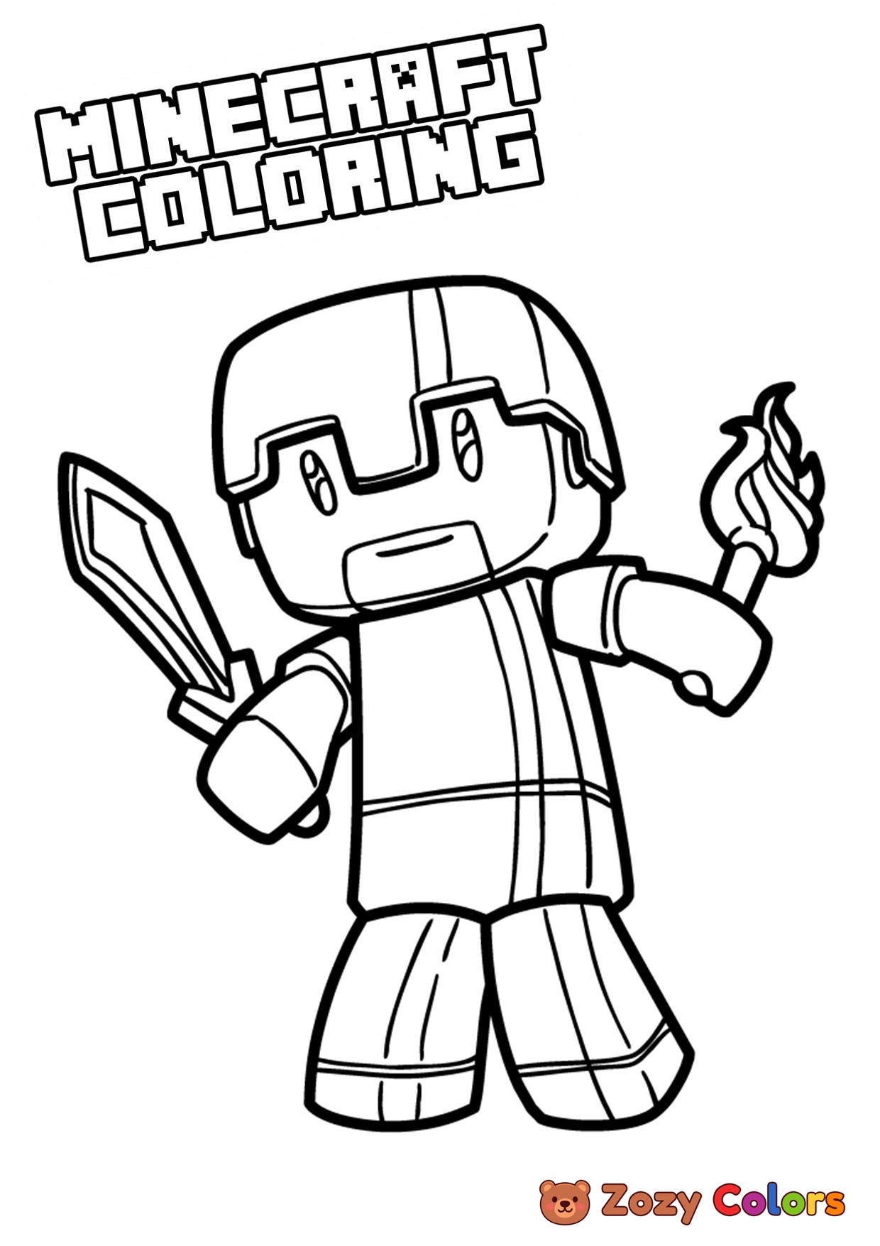 Minecraft Steve with a sword and torch. Coloring page to print or download and color for your kids.