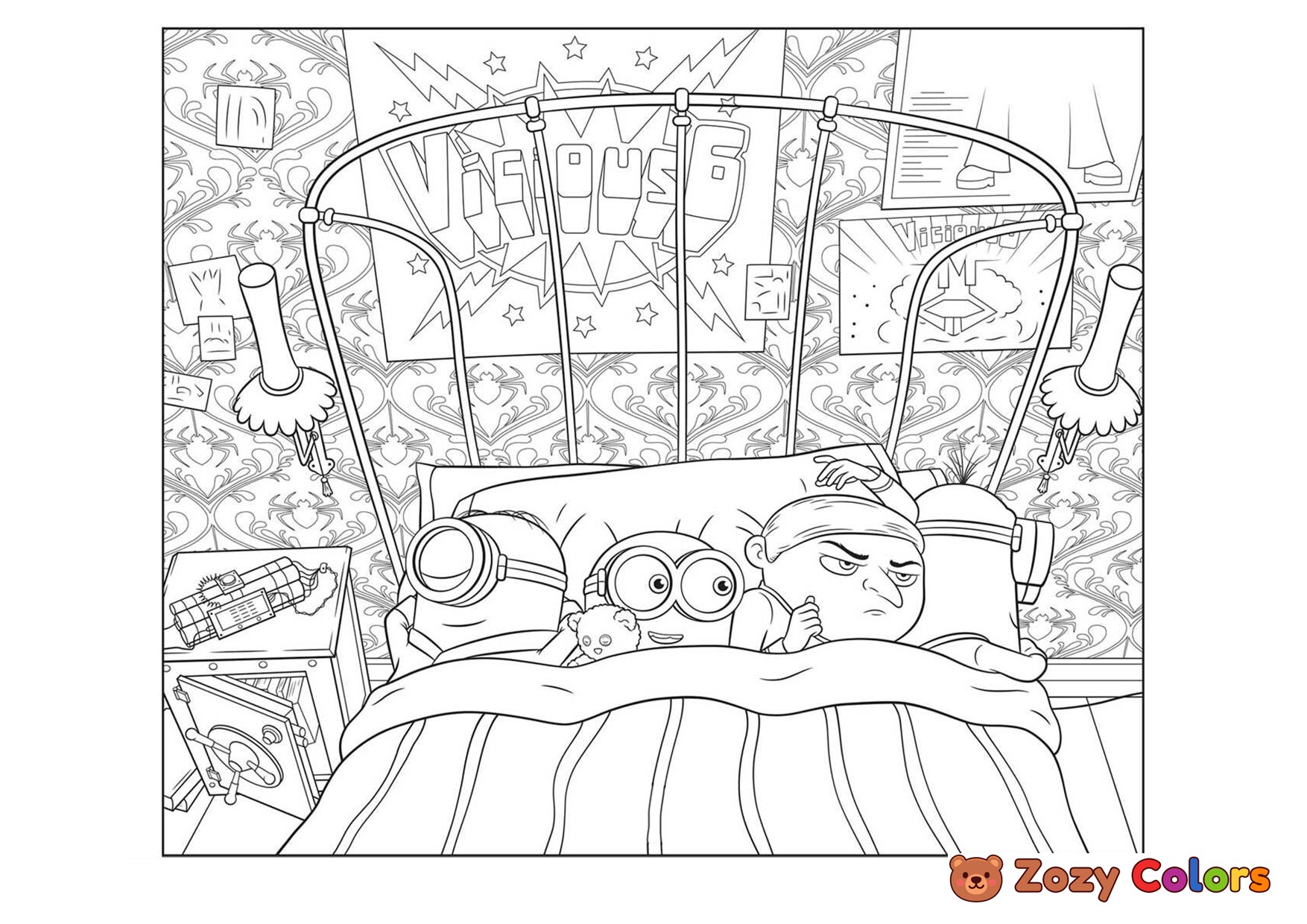 Minions and Gru in bed. Coloring page to print or download and color for your kids.
