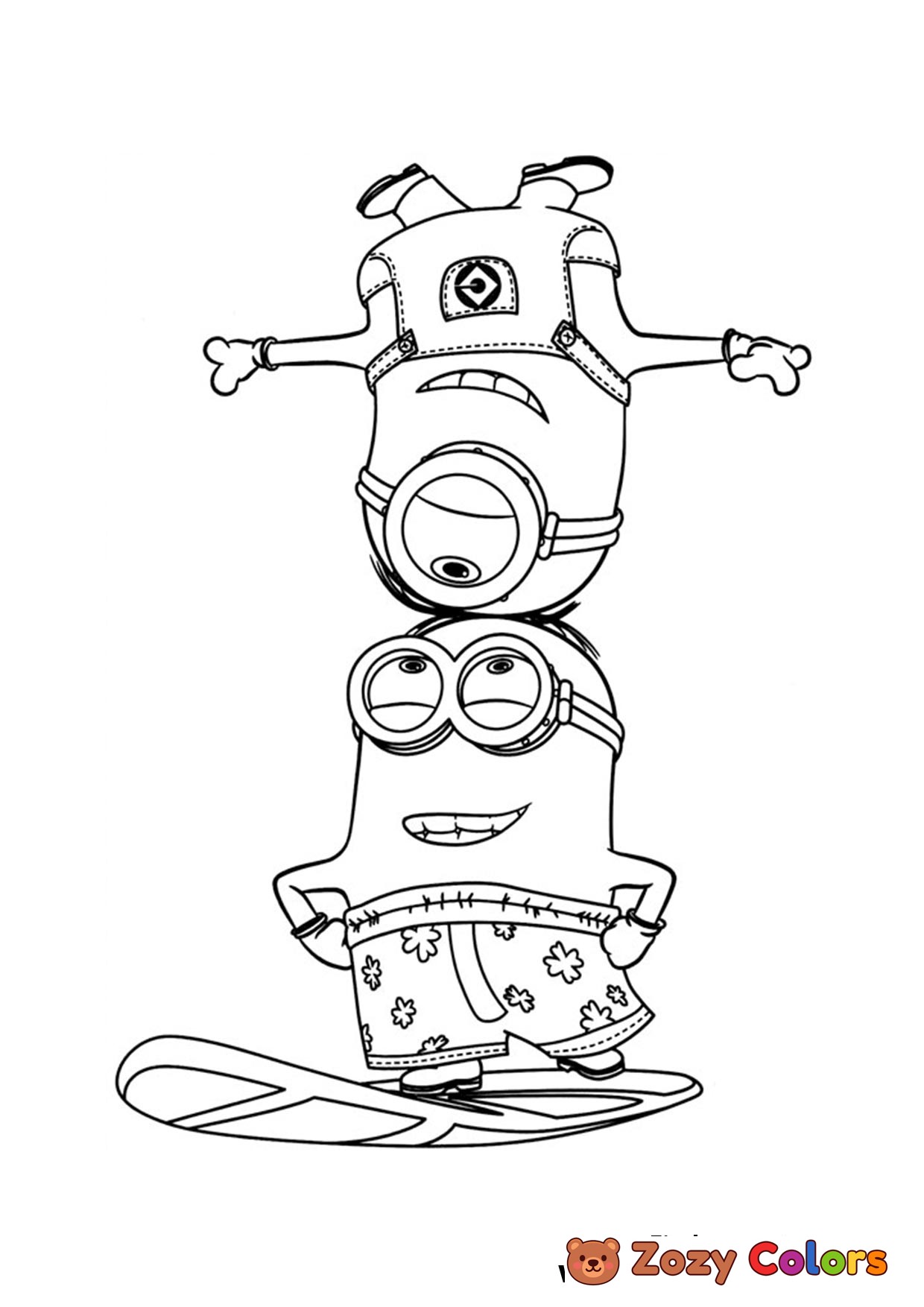Minions Stuart and Bob surfing looking goodon that surfboard. Coloring page to print or download and color.