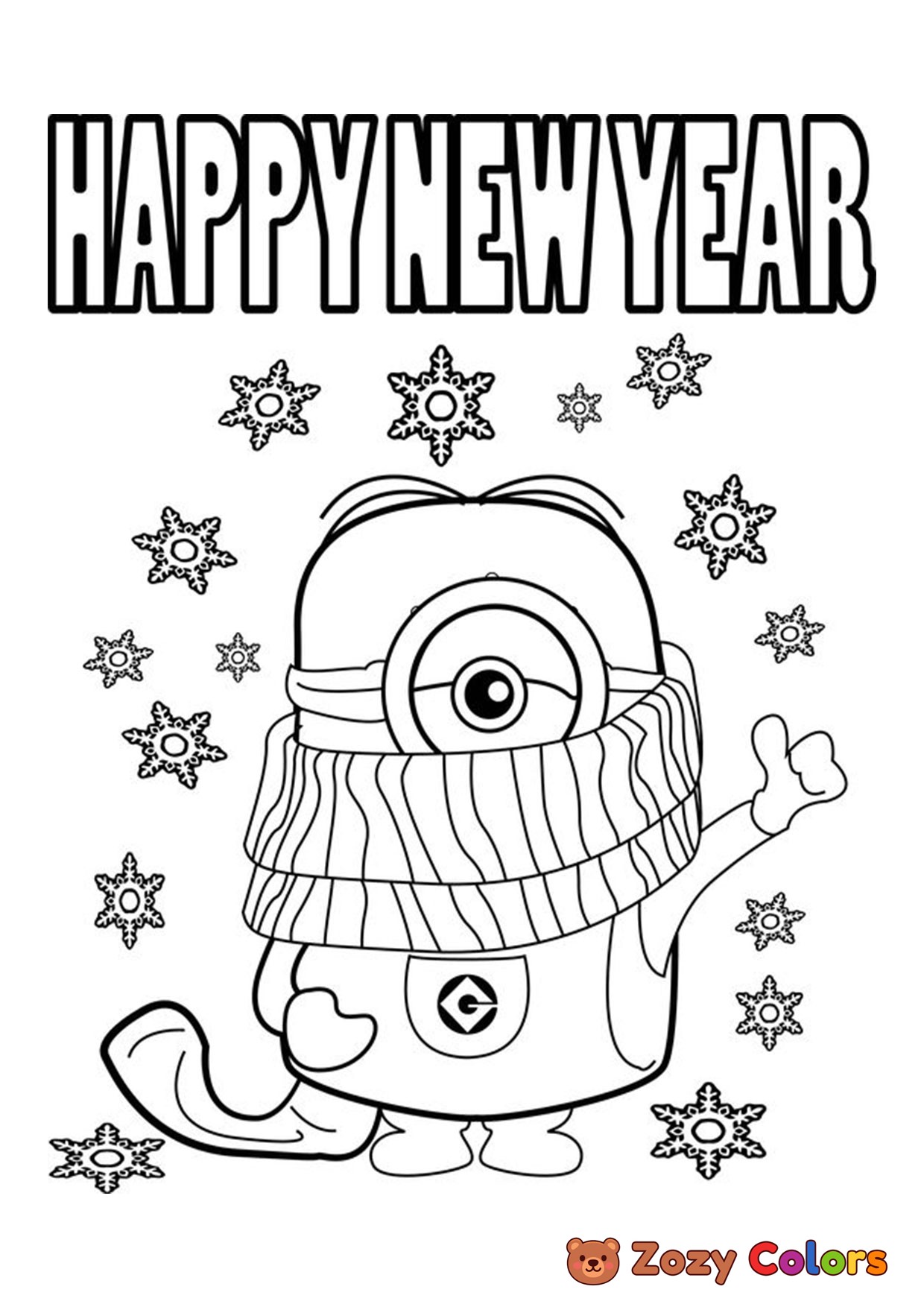 Minions wishing Happy New Year. Coloring page to print or download and color for your kids.