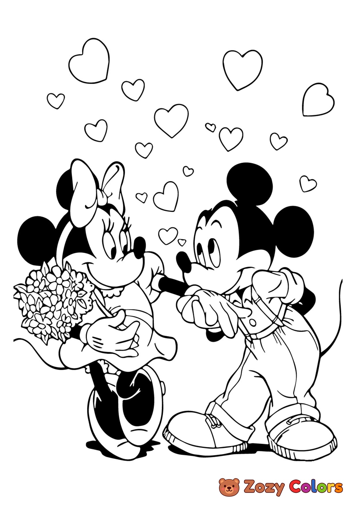 Minnie and Mickey valentine. Coloring page to print or download and color for your kids.