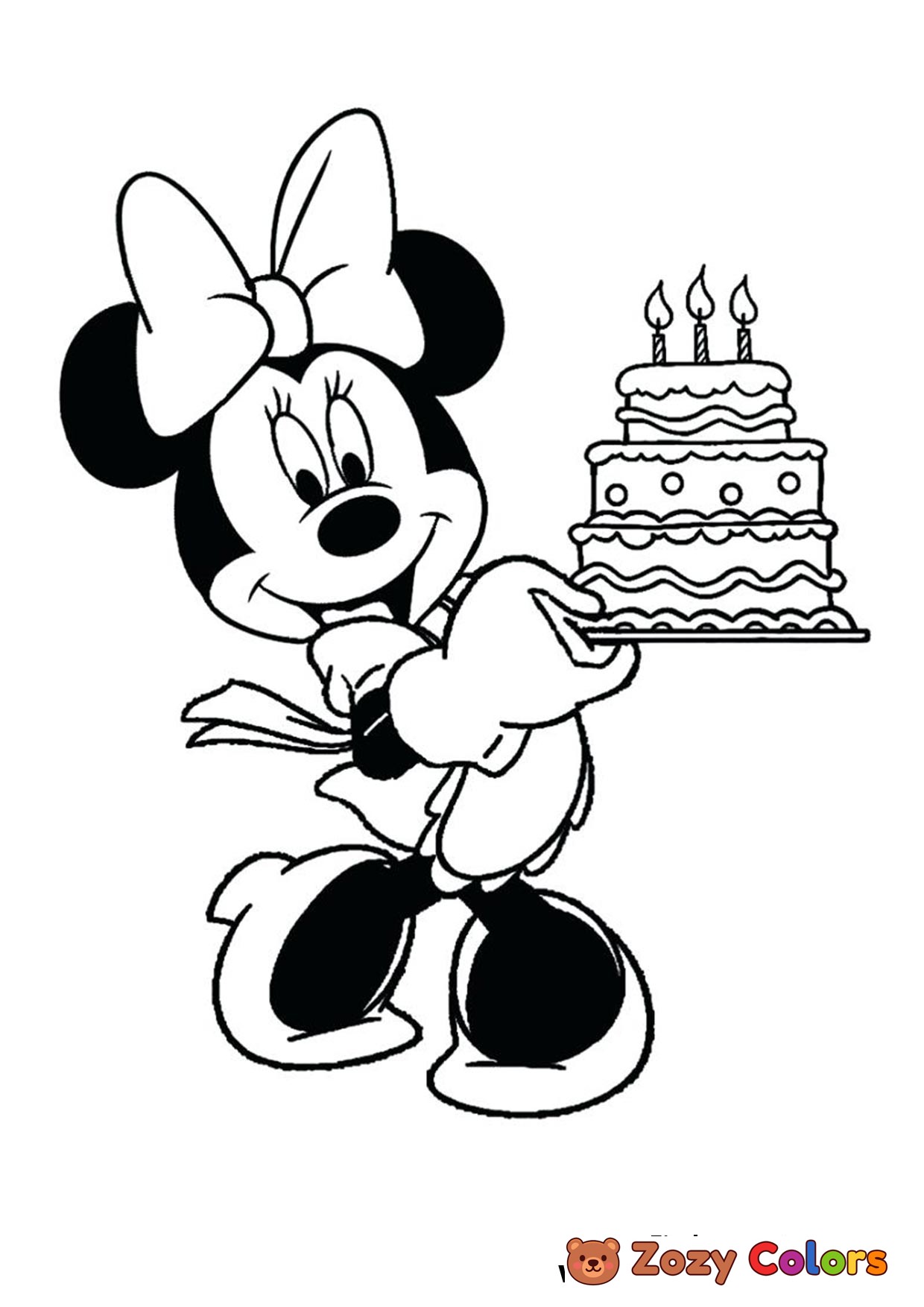 Minnie Mouse with a birthday cake. Coloring page to print or download and color.