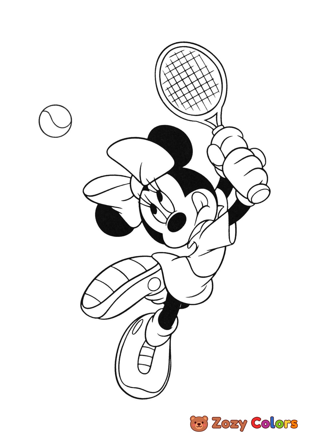 Minnie Mouse playing tennis. Coloring page to print or download and color for your kids.