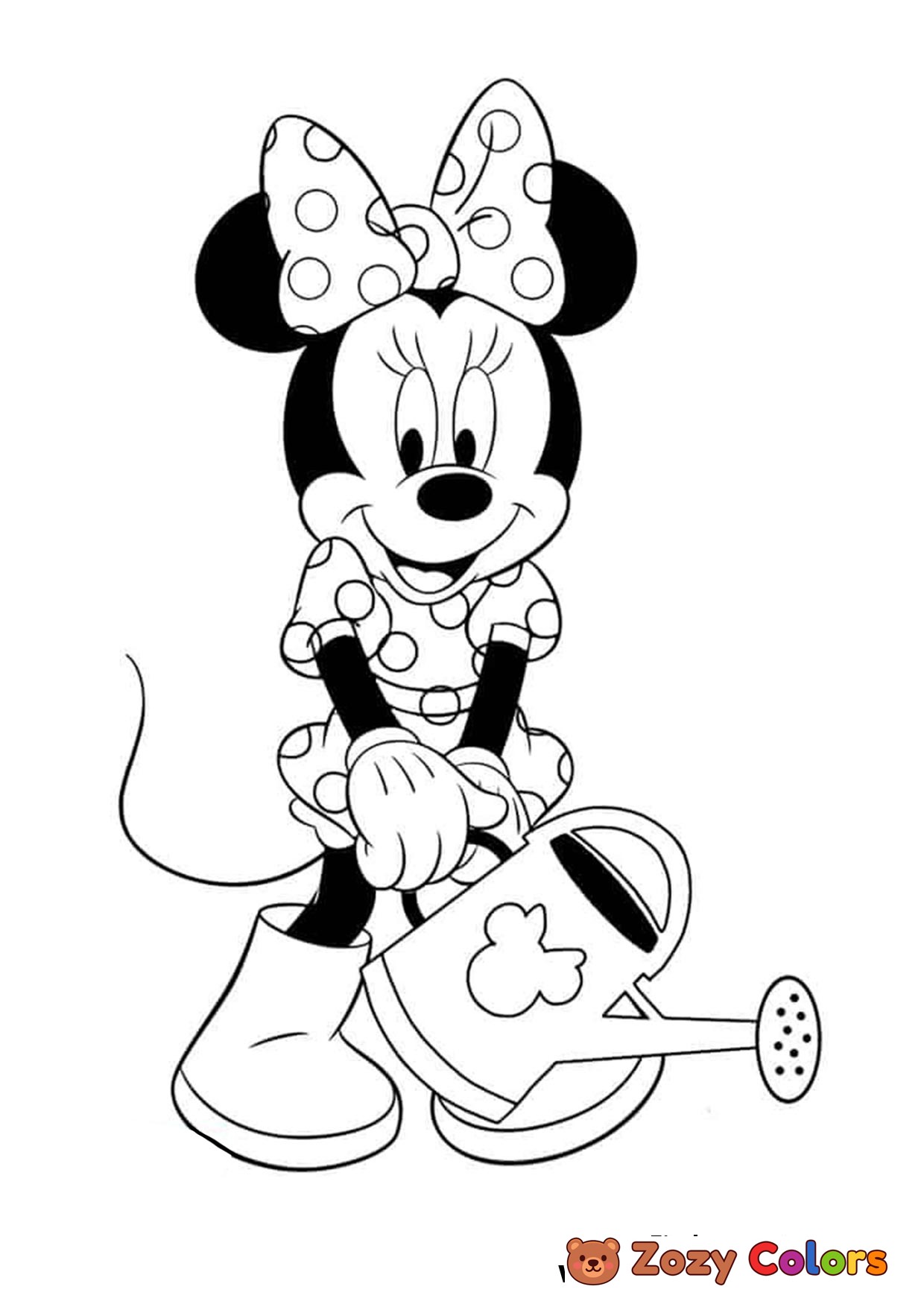 Minnie Mouse with a watering can. Coloring page to print or download and color.