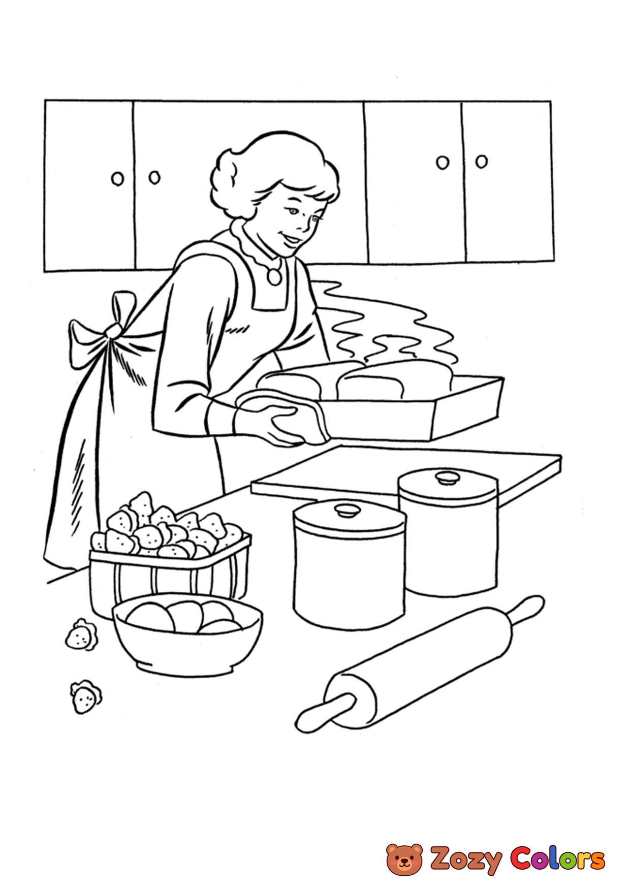 Mother preparing Thanksgiving day family dinner. Coloring page to print or download and color for your kids.