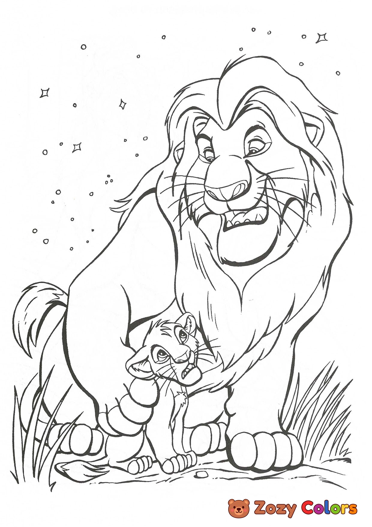 Mufasa and Simba watching stars. Coloring page to print or download and color for your kids.