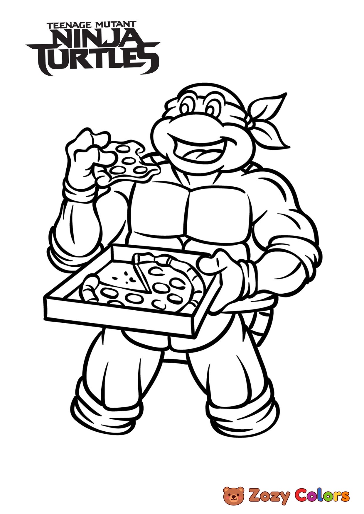 Mutant turtle eating pizza. Coloring page to print or download and color for your kids.