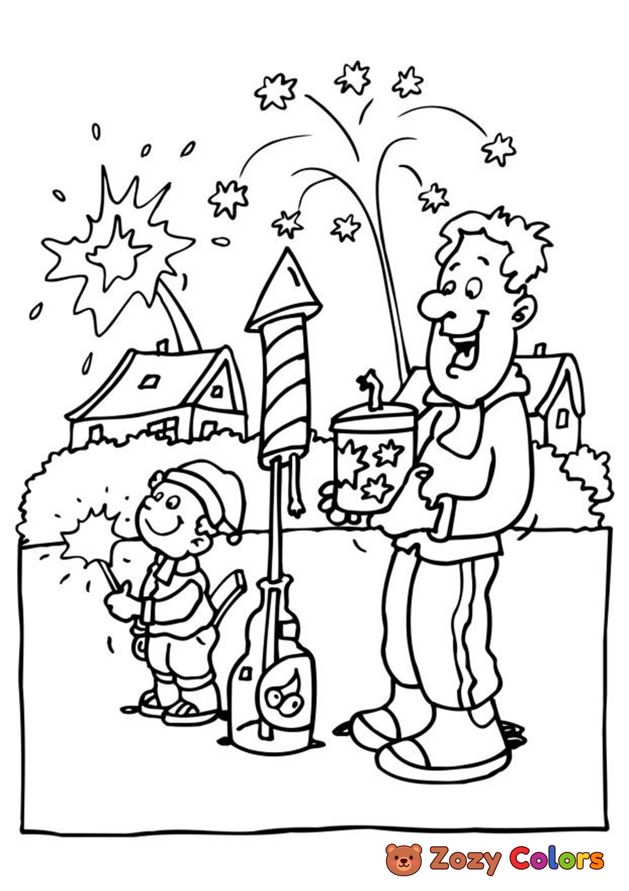 New years family fireworks. Coloring page to print or download and color for your kids.
