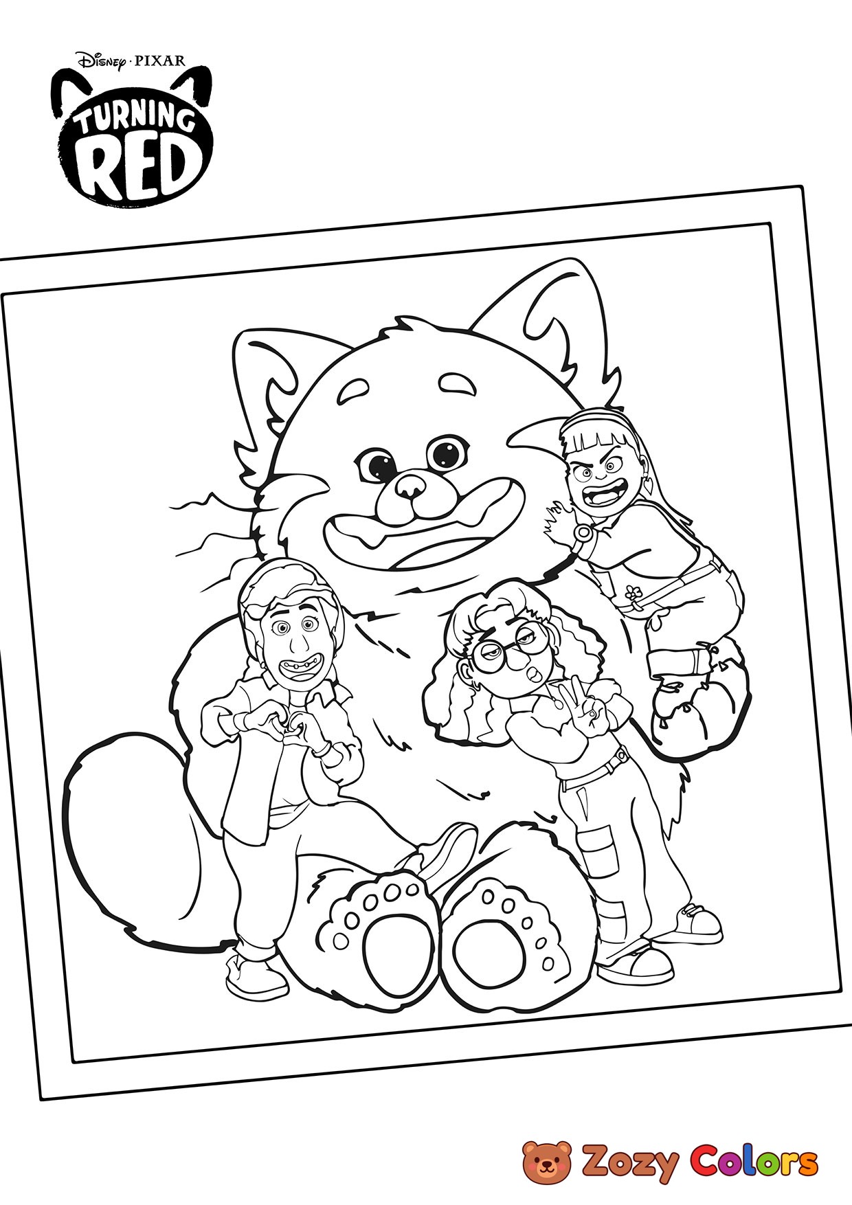 Panda Mei with friends. Coloring page to print or download and color for your kids.