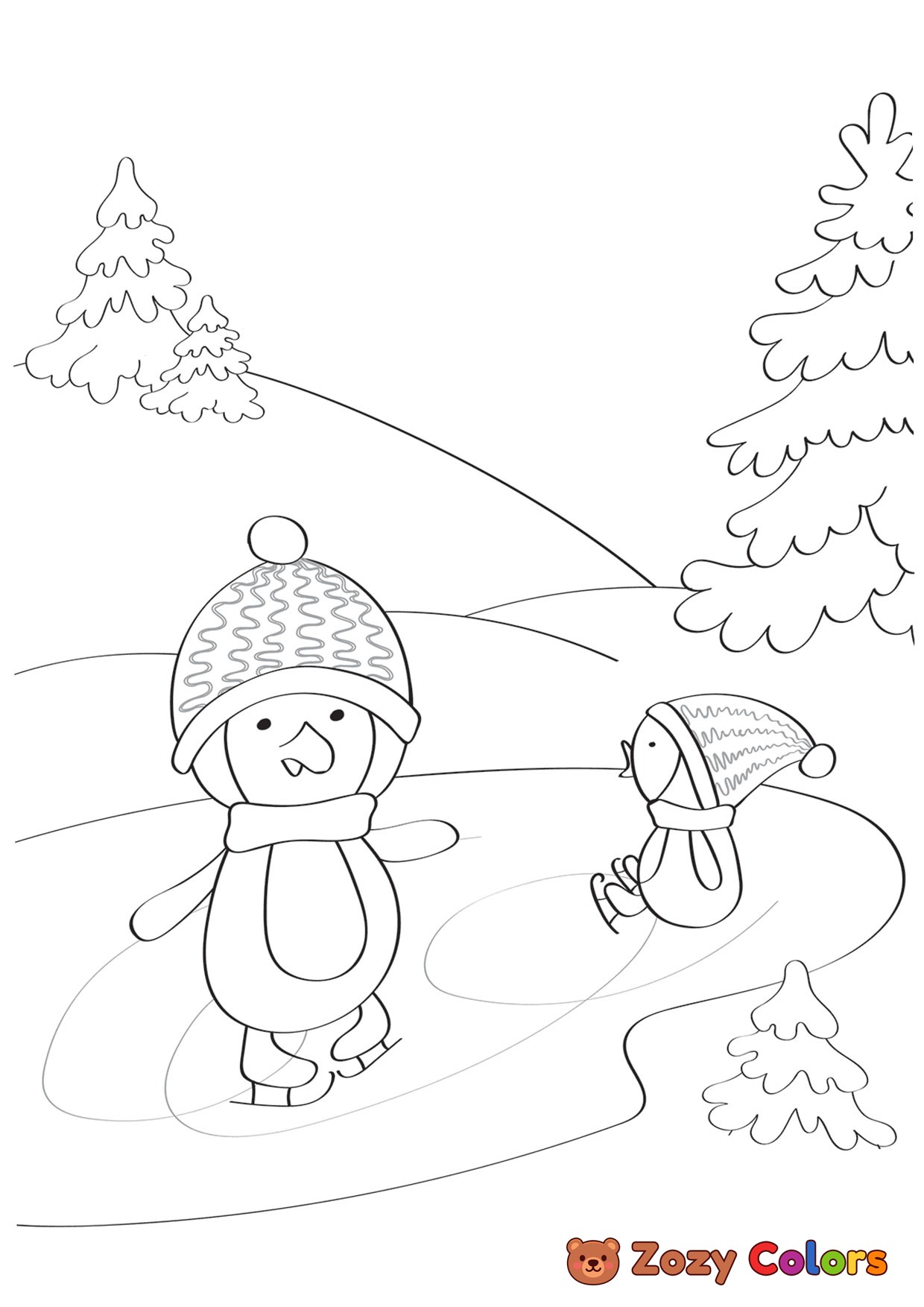 Penguins ice skating. Coloring page to print or download and color for your kids.
