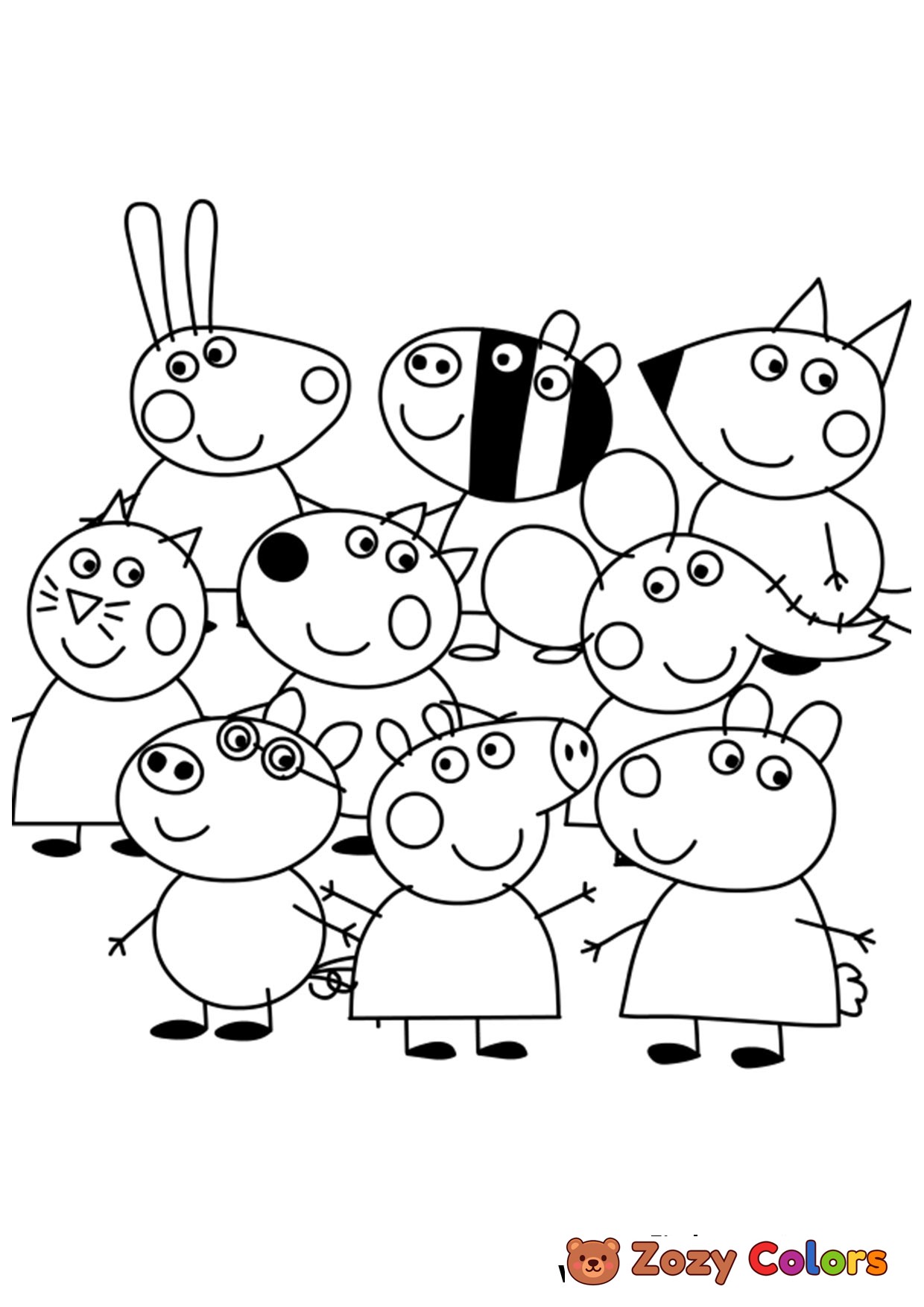 Peppa Pig and friends having fun together. Coloring page to print or download and color.