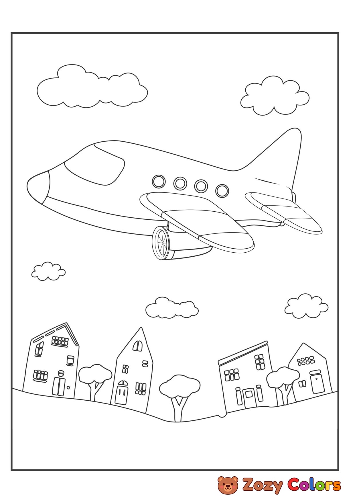 Plane flying over the city. Coloring page to print or download and color for your kids.