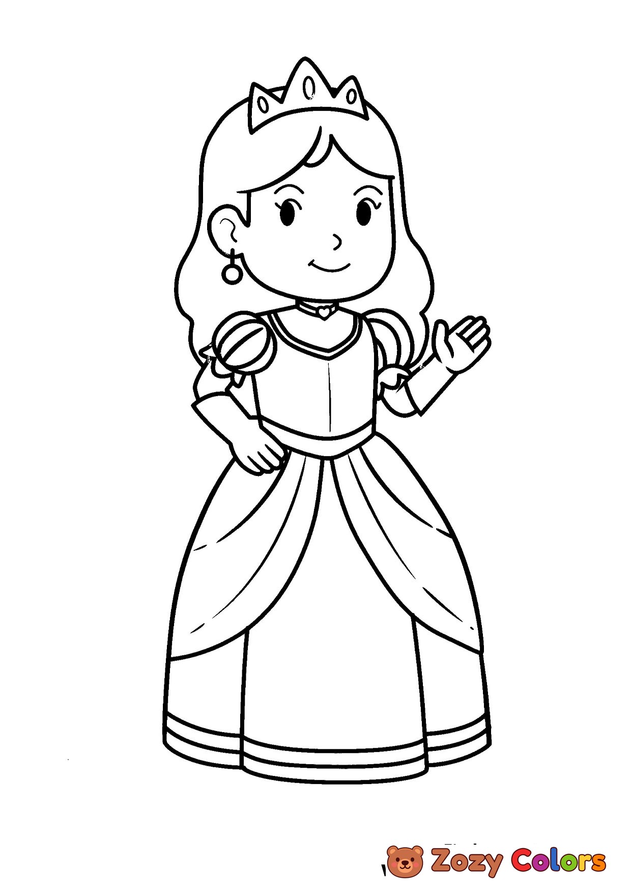 Princess with gloves being cute and waving. Coloring page to print or download and color for your kids.