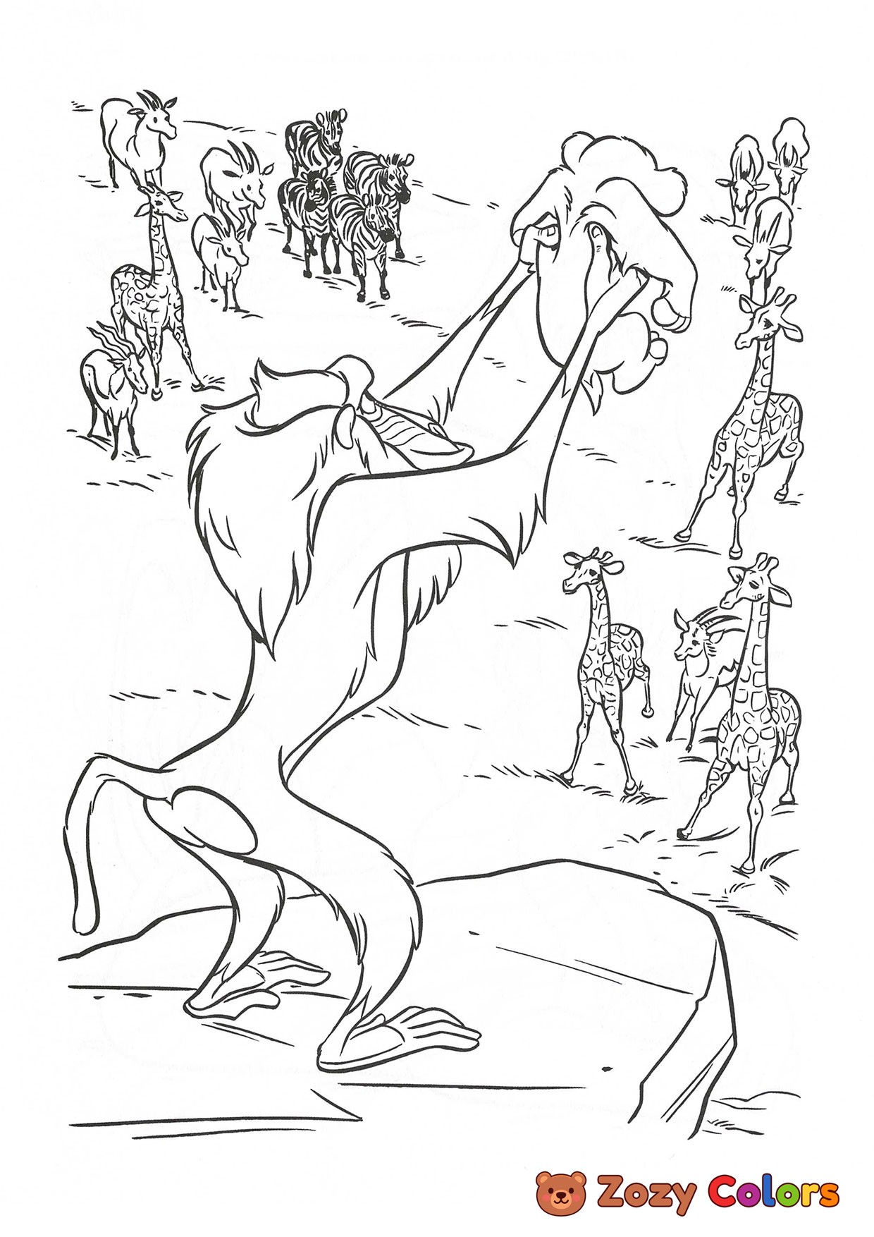 Rafiki presenting Simba to animal kingdom. Coloring page to print or download and color for your kids.