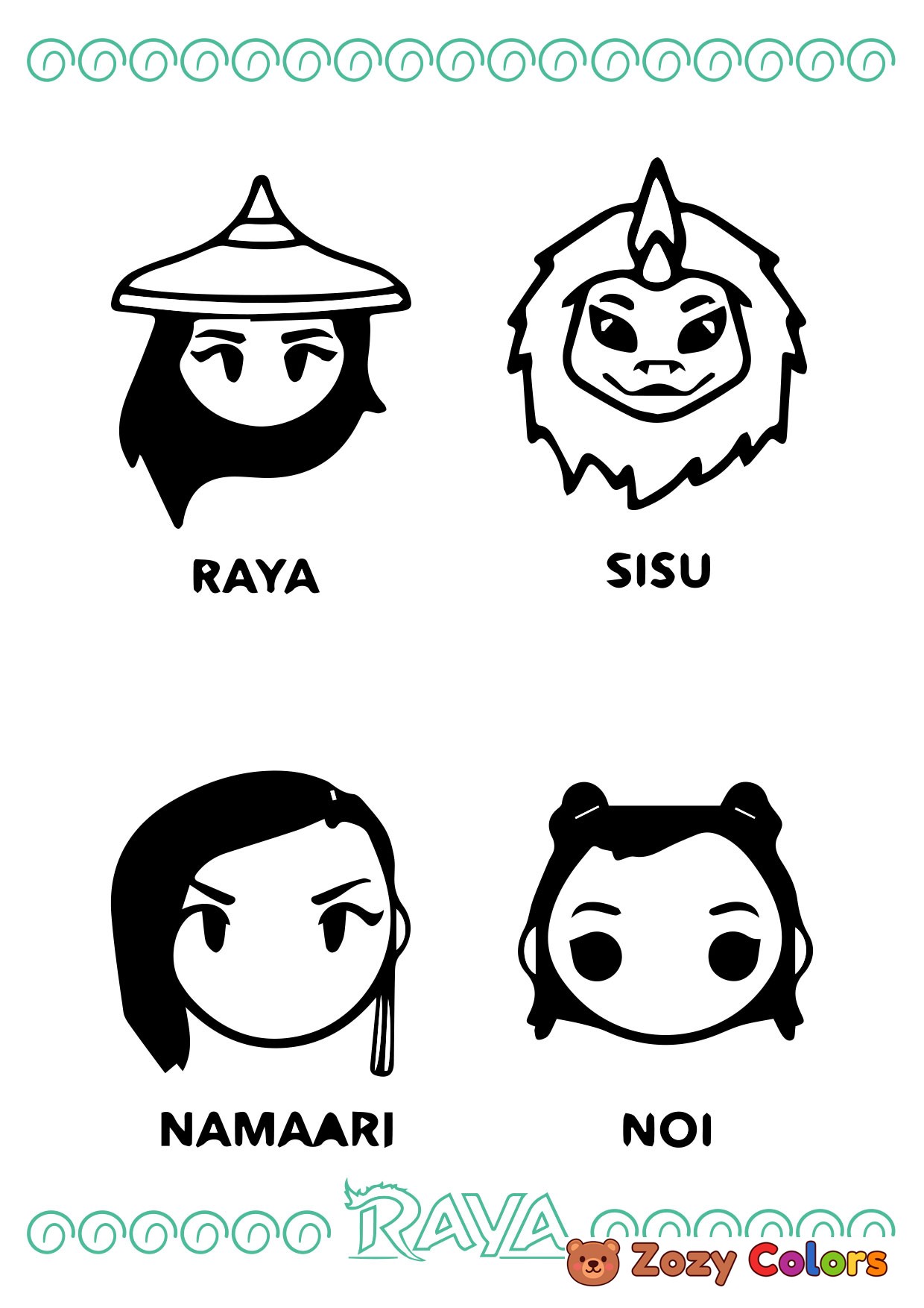 Raya and The Last Dragon characters portraits. Coloring page to print or download and color for your kids.