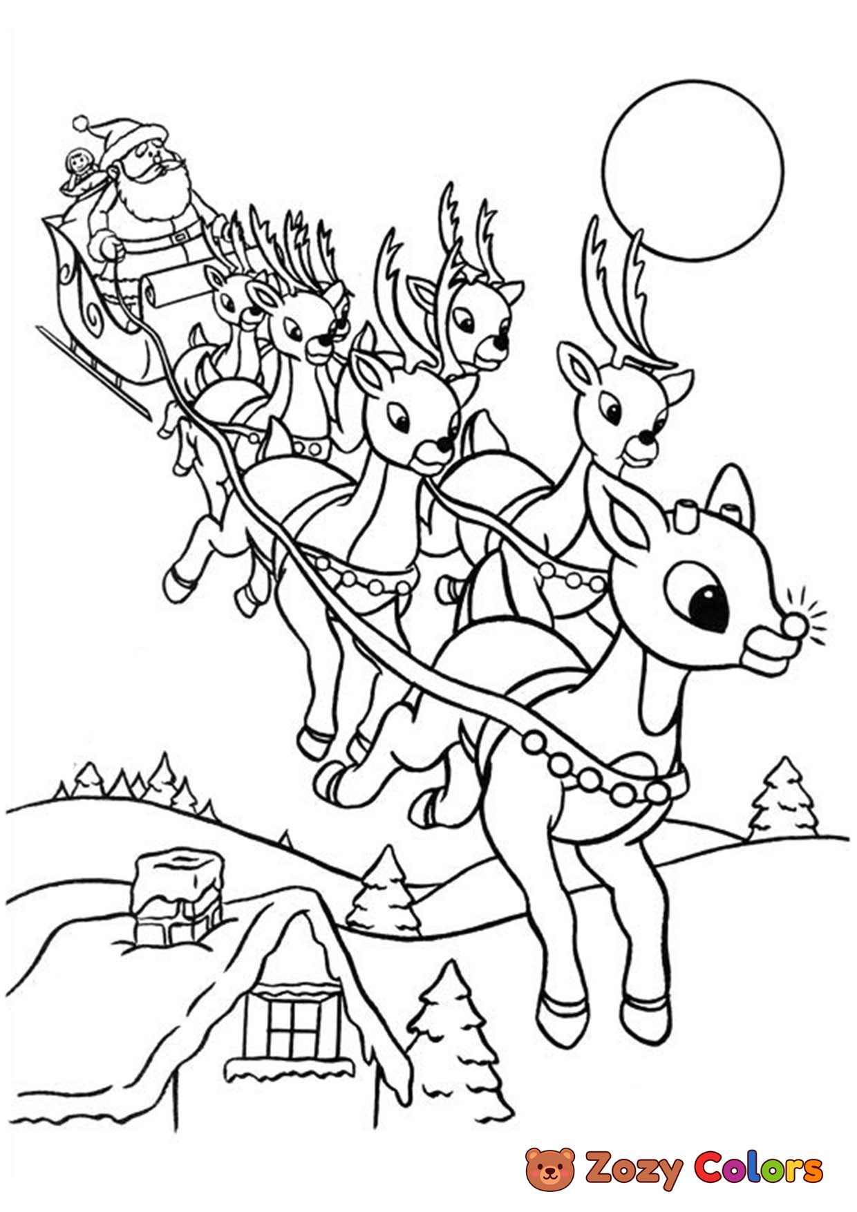 Rudolph the raindeer pulling Santa. Coloring page to print or download and color for your kids.