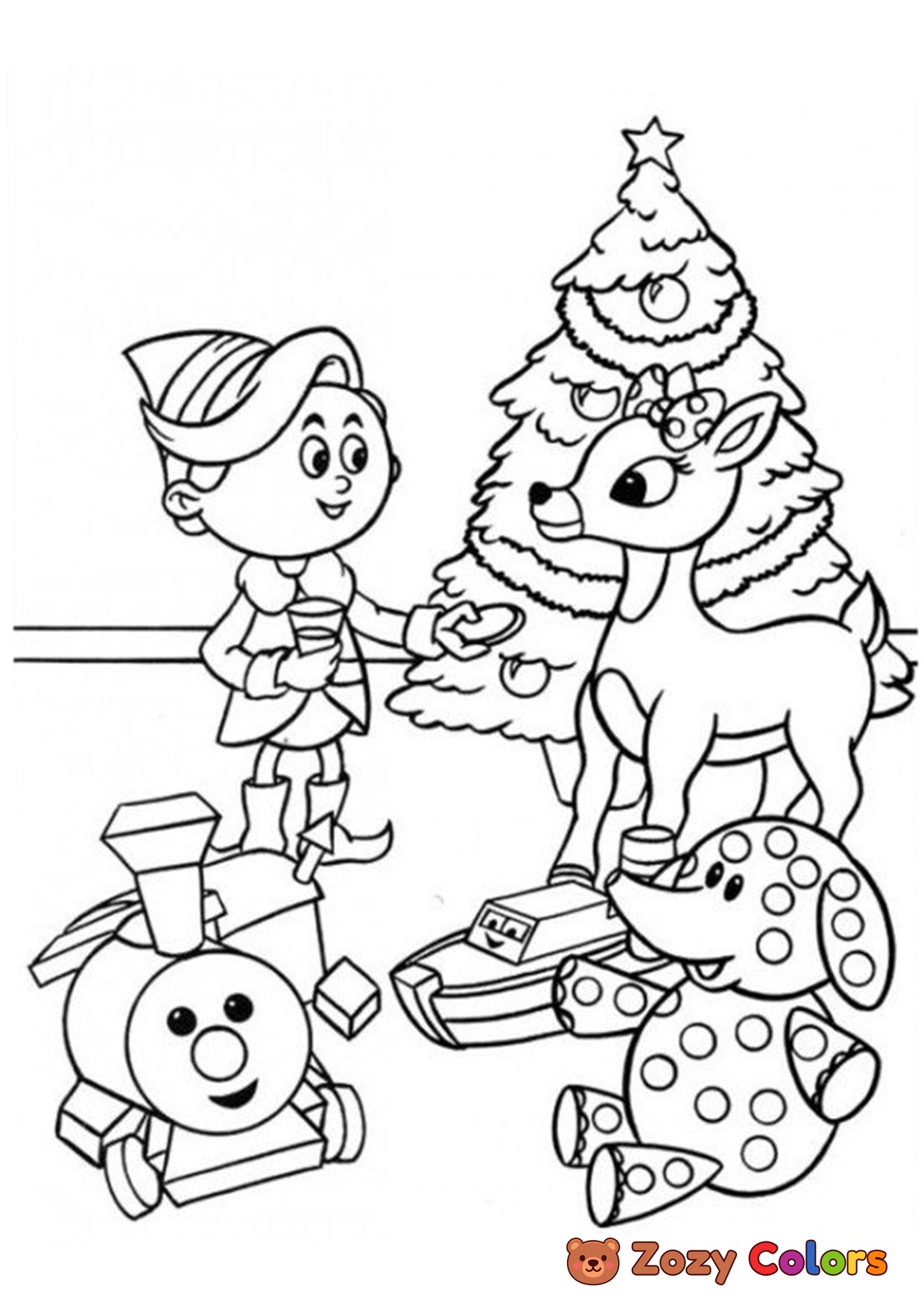 Rudolph the raindeer with an elf. Coloring page to print or download and color for your kids.