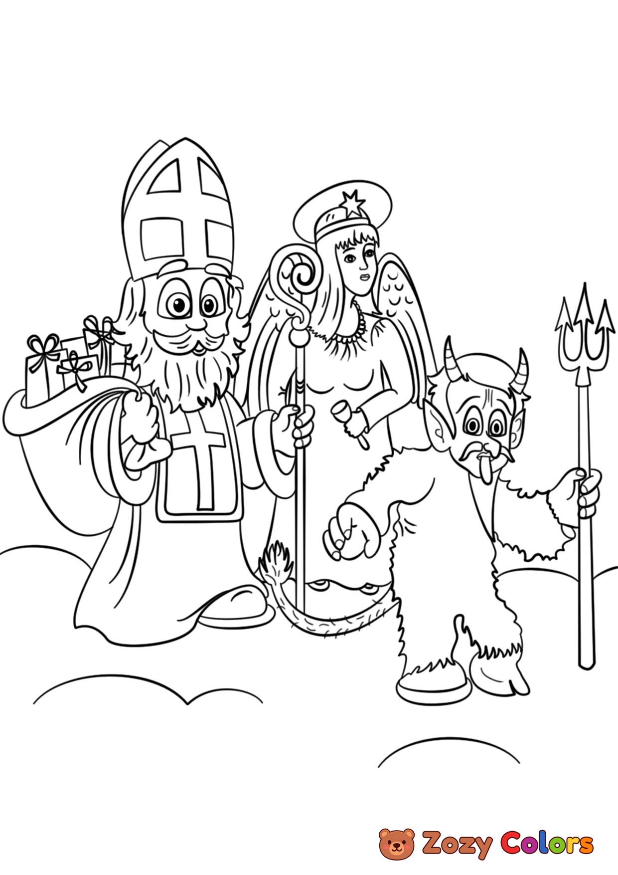 Saint Nicholas with helpers. Coloring page to print or download and color for your kids.