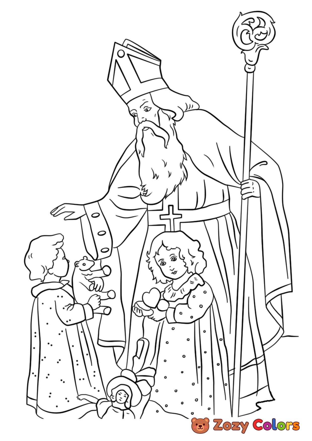 Saint Nicholas with kids. Coloring page to print or download and color for your kids.