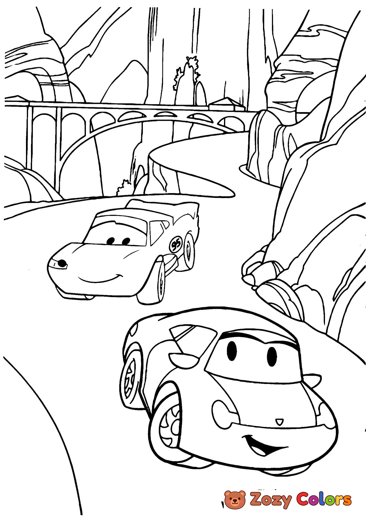 Sally Carera racing in the mountains. Coloring page to print or download and color for your kids.