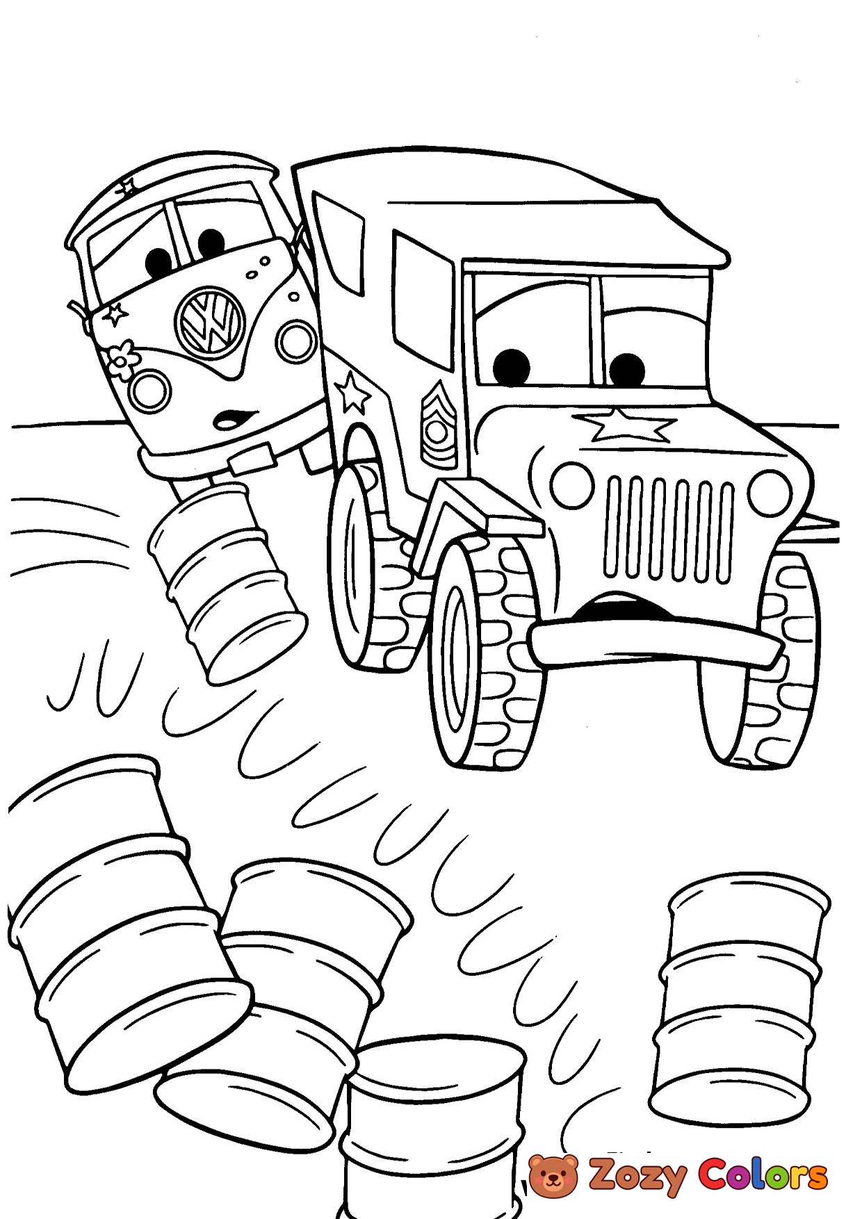 Sarge knocking down barels. Coloring page to print or download and color for your kids.