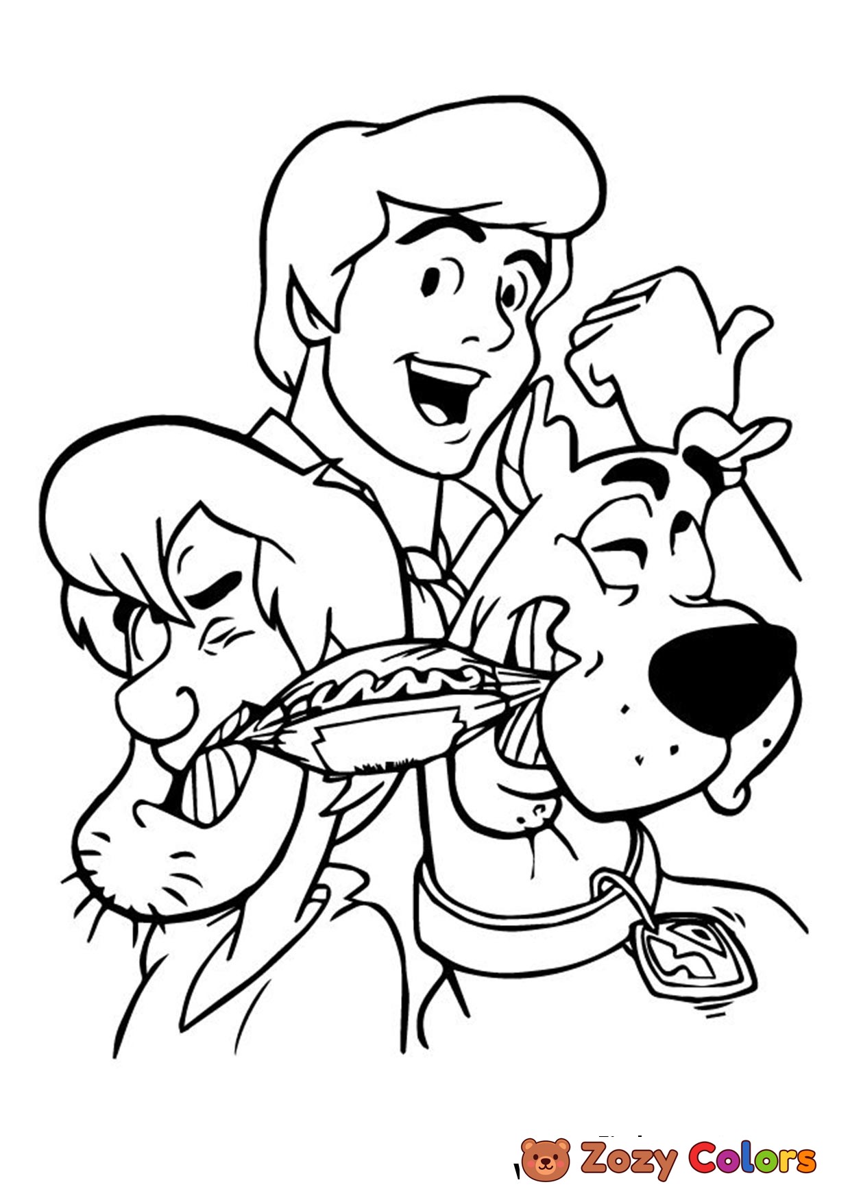 Scooby-Doo, Shaggy and Fred fighting for a hot dog. Coloring page to print or download and color.