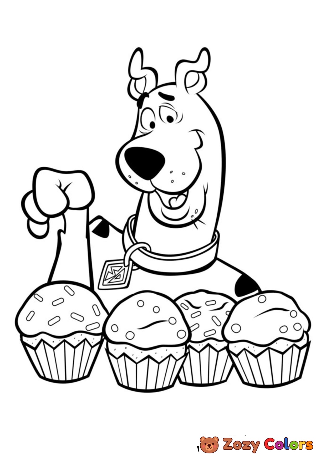 Scooby-Doo looking at delicious muffins. Coloring page to print or download and color.