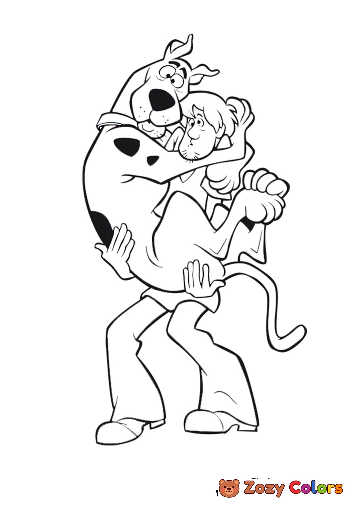 Scooby-Doo in Shaggy's arms, being afraid. Coloring page to print or download and color.