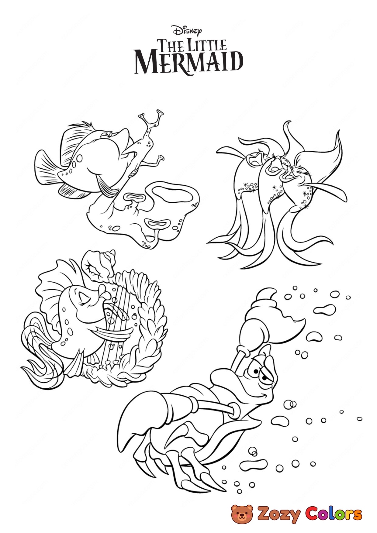 Sebastian and fish from The Little Mermaid. Coloring page to print or download and color for your kids.
