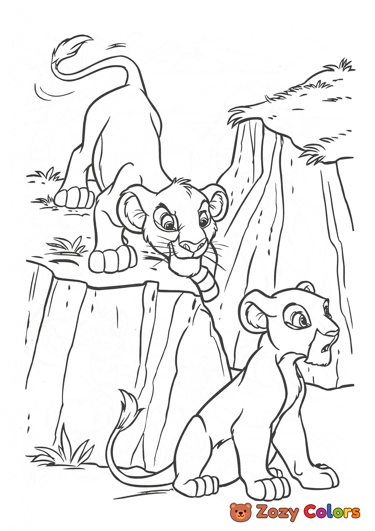 Simba and Nala playing. Coloring page to print or download and color for your kids.
