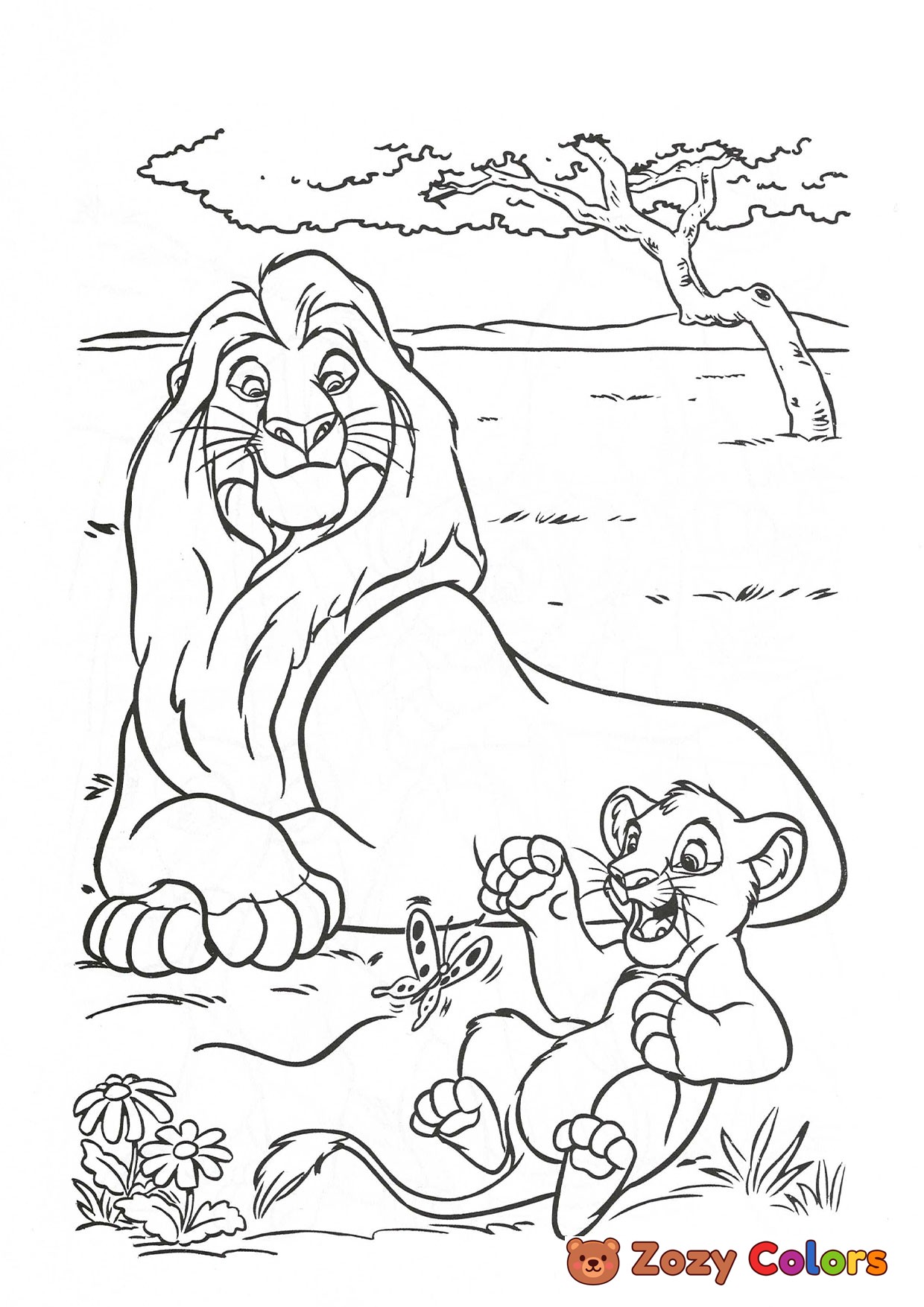 Simba playing and Mufasa watching him. Coloring page to print or download and color for your kids.