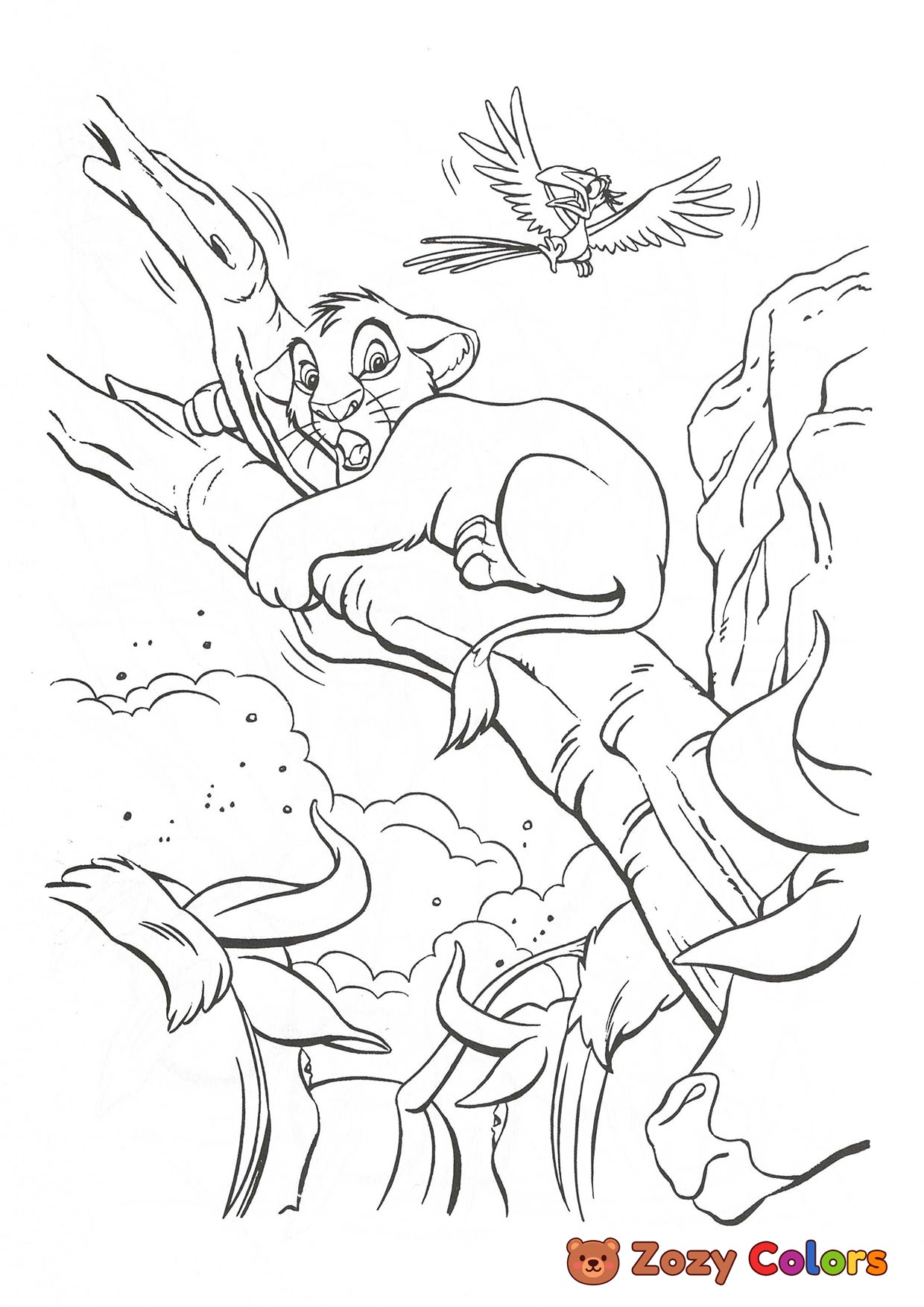 Simba scared in a stampede. Coloring page to print or download and color for your kids.