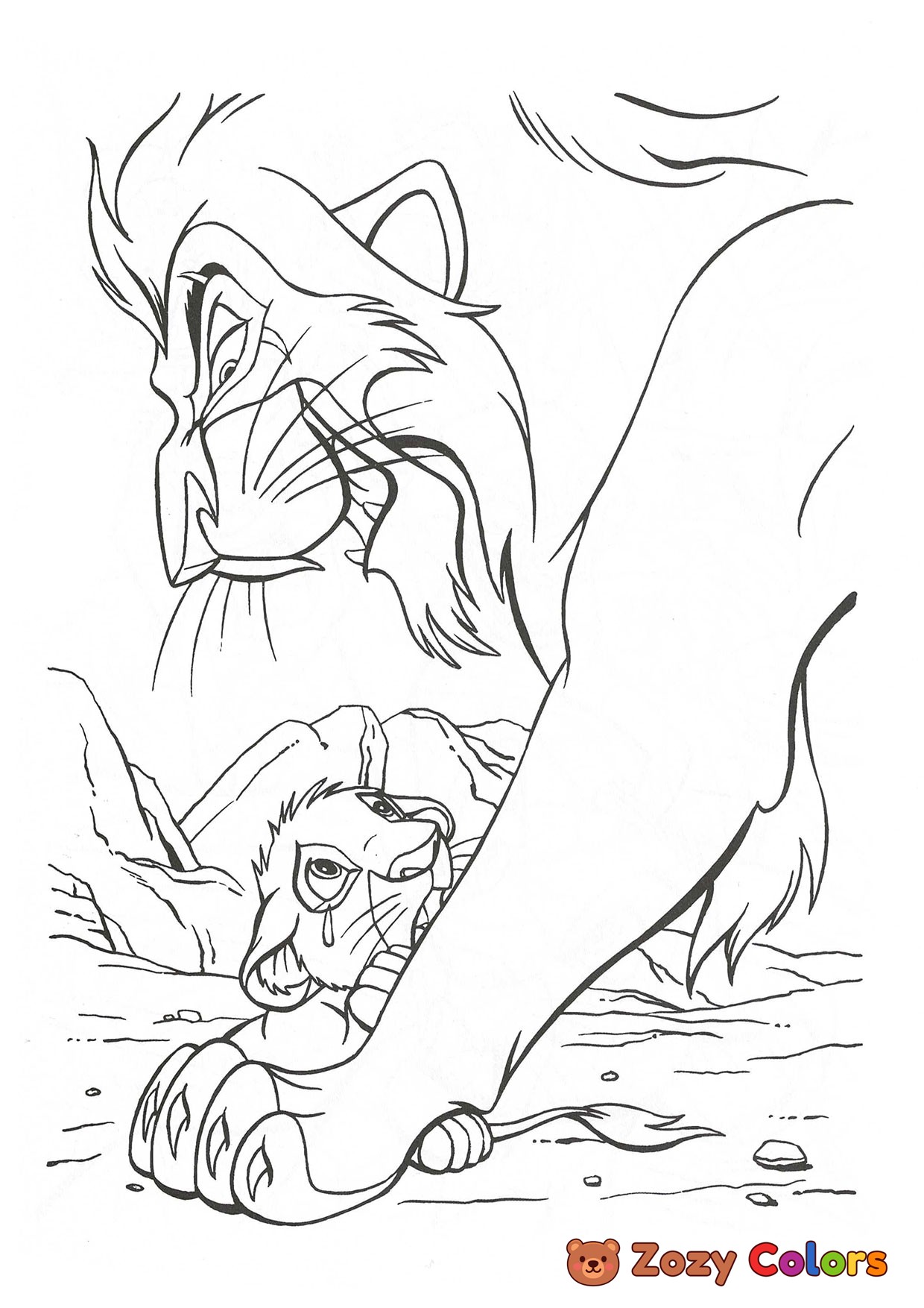 Simba scared of uncle Scar. Coloring page to print or download and color for your kids.