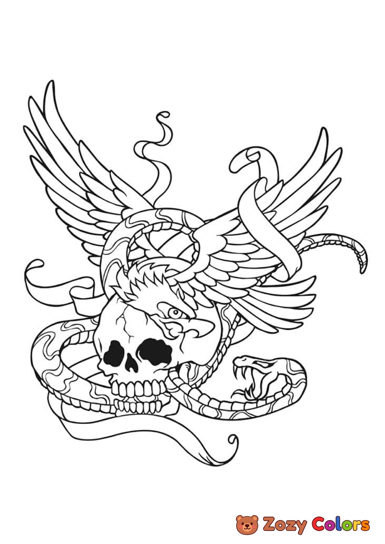 Skull and snake. Free adult printable coloring page, pdf's and sheets.