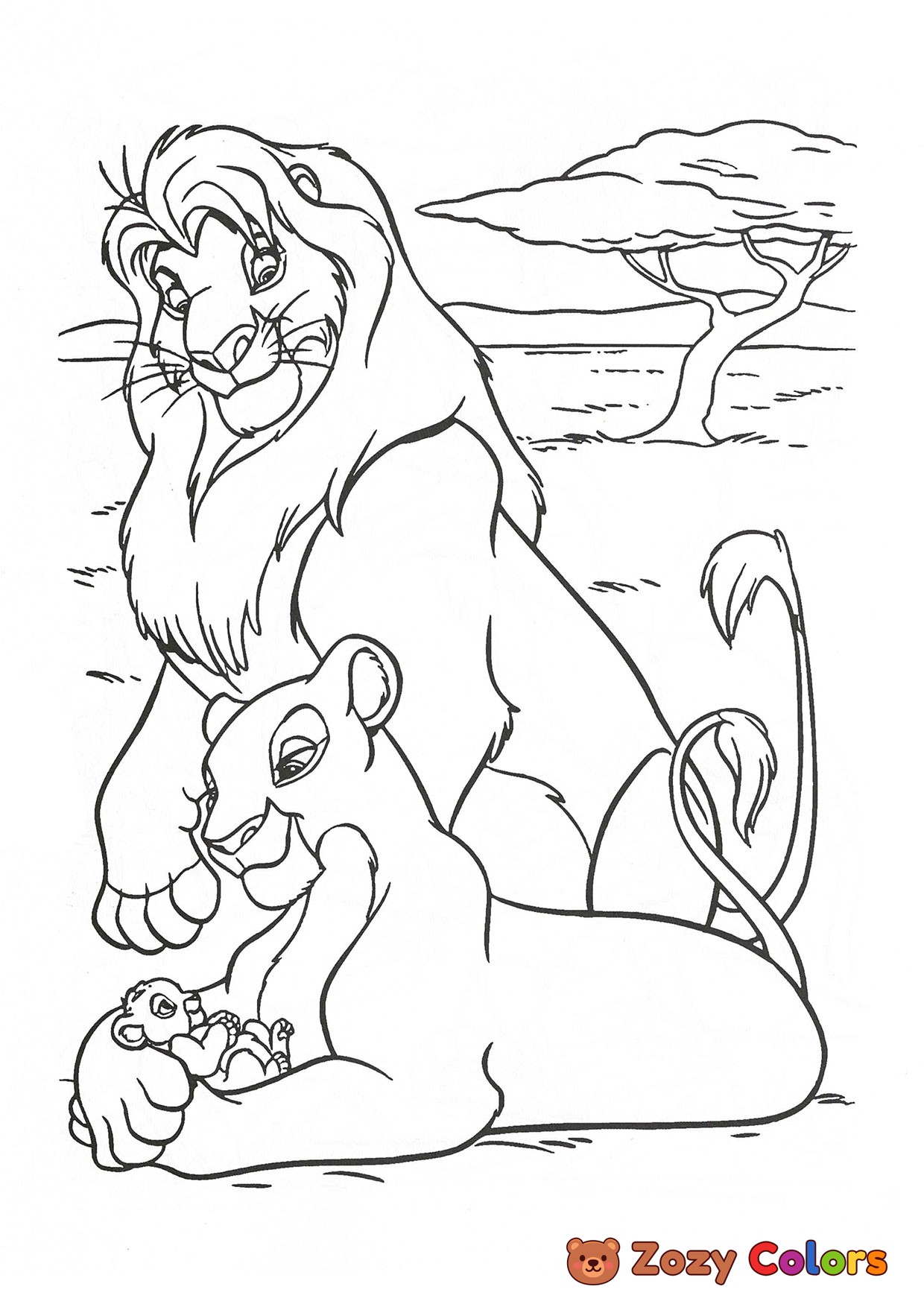 Small Simba with his parents. Coloring page to print or download and color for your kids.