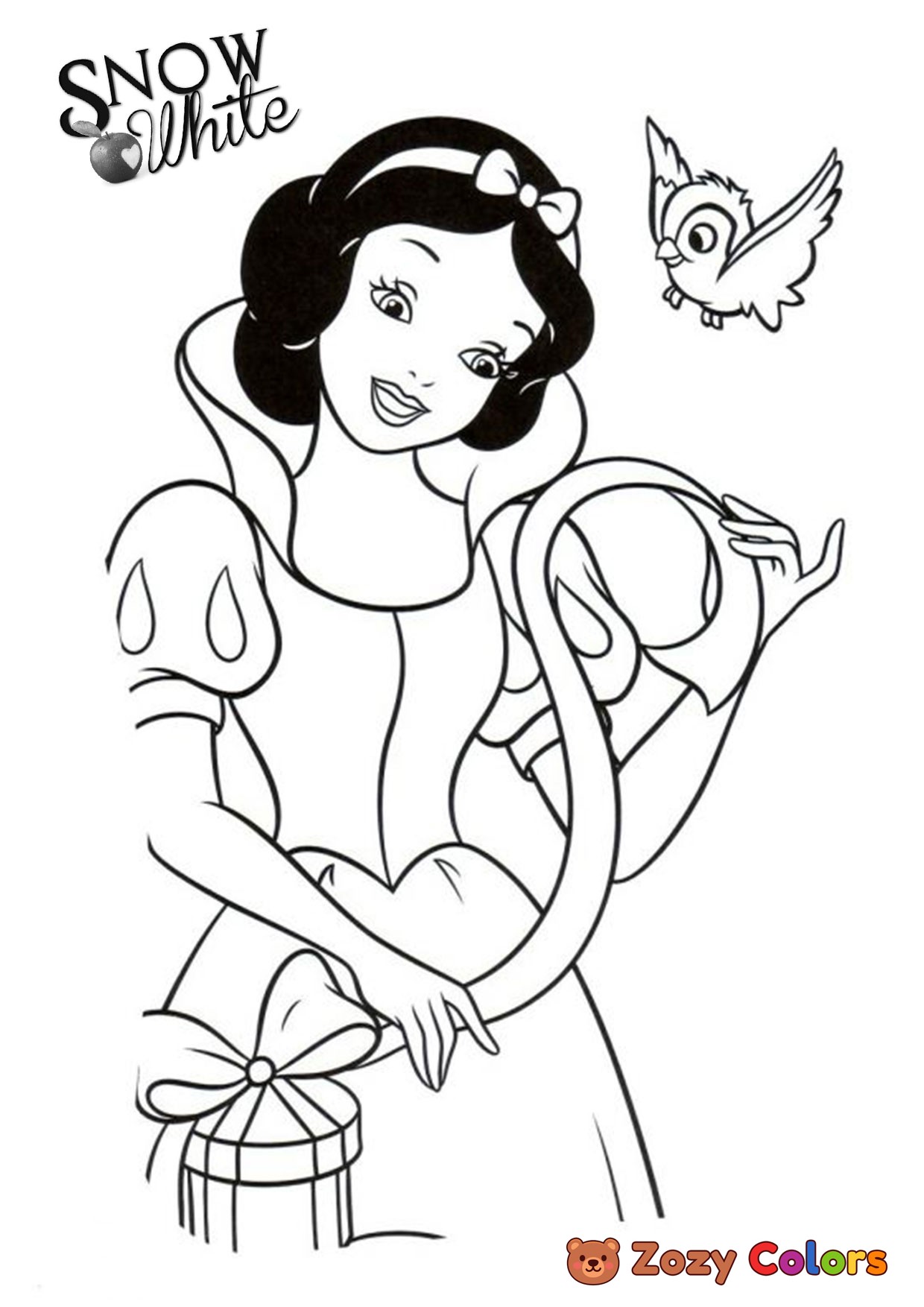 Snow White with a bird. Coloring page to print or download and color for your kids.